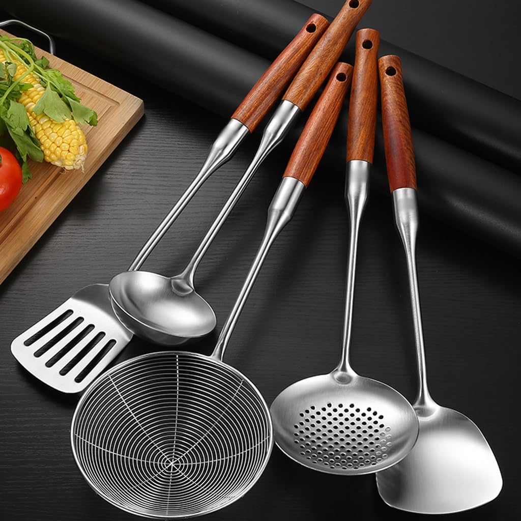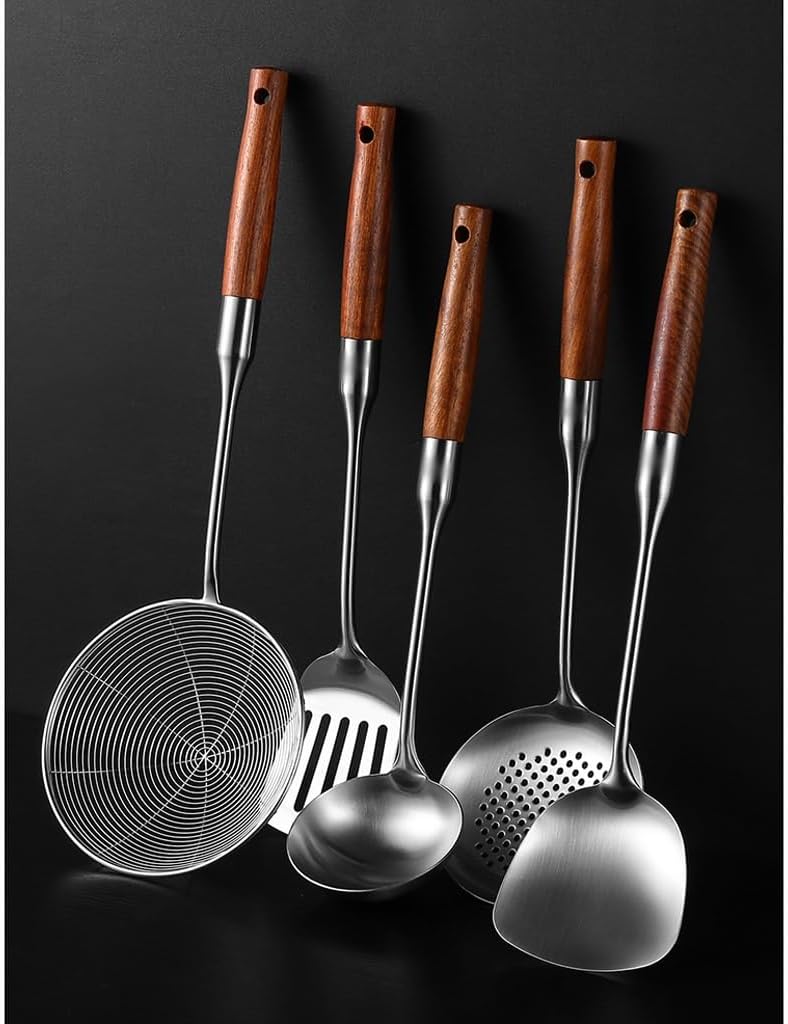 Thickened stainless steel allows for direct contact with food ingredients, making it safe for family members to use.The insulated handle has a comfortable grip, effortless cooking, warm and moist feel, and good insulation performance.Hanging holes for storage save space.Independently vacuum and prevent scalding, effectively reducing heat transfer.grinding with rounded and smooth edges without burrs is safe to use without damaging the pot.Name: Five Piece Kitchenware SetMaterial: stainless steelColor: As shown in the pictureNumber of pieces: 5 piecesSpecification: Five piece set of kitchen utensils * 11. Due to screen display differences, there may be slight color differences in the visual system. Please refer to the product received.2. Manual measurement may have slight errors, please understand.