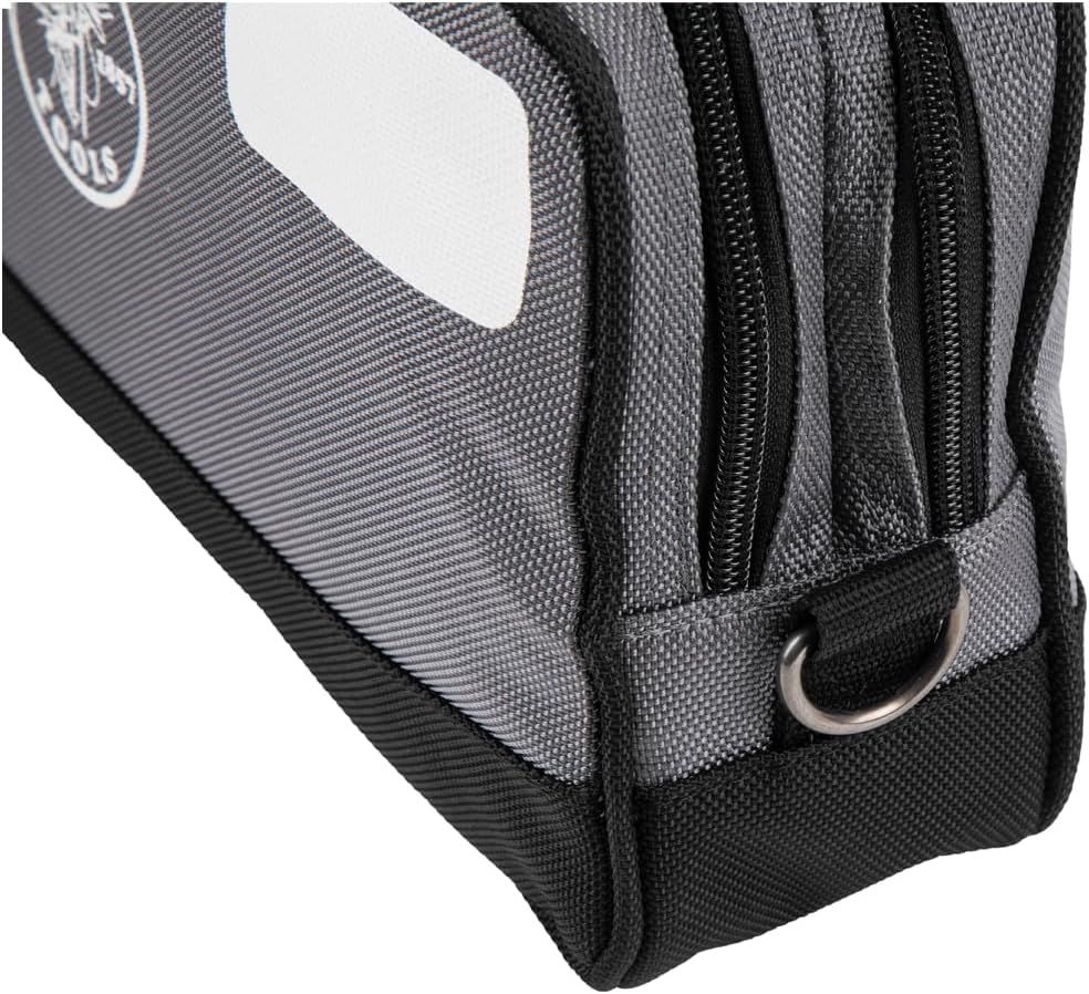 Easily access and organize tools and small parts with the Klein Tools Double-Zipper Tool Bags. These heavy-duty, water-resistant bags feature two compartments with a reinforced bottom; the gray bag measures 12-Inch x 7-Inch and has D-Rings on both ends to attach carabiners or a shoulder strap and the orange bag measures 10-Inch x 6-Inch and has a handle for easy carrying. Both bags have a 3-Inch flat bottom that keeps the bag upright with a white space on front to write contents or name.
