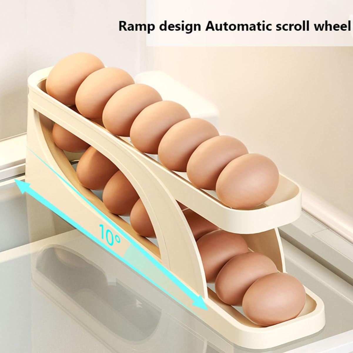 Egg Dispenser for Refrigerator Set * 2pcs egg container for refrigerator Automatic Rotation The holder's unique rotation design ensures that your eggs are always fresh. As you remove eggs from the front of the holder, the remaining eggs roll forward, ensuring that the oldest eggs are always at the front Durable Construction Made from high-quality, BPA-free plastic, this holder is designed to last. You can be sure that your eggs will be stored safely and securely in this holder