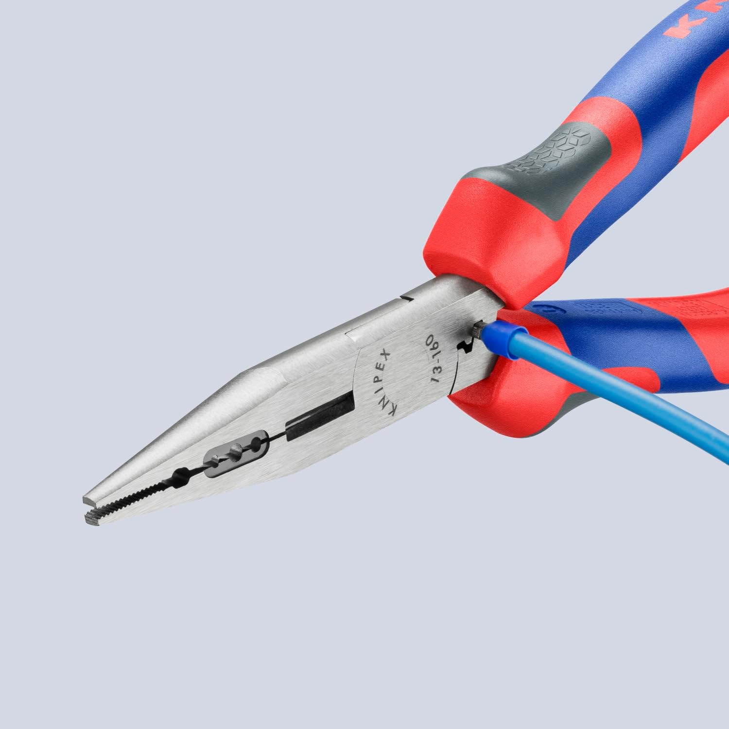 KNIPEXTEND comfort handles make it easy to identify your tools and utilize the KNIPEX TetheredTool System lanyards and adapters by simply adding KNIPEXTEND ColorCoded Clips and TetheredTool Clips (KNIPEXTEND accessories sold separately). 4 functions in one pliers - grips, cuts, strips and crimps. Ideal for cable and wire work. For cutting soft, medium and hard wire. Precision cutting edges induction hardened, cutting edge hardness (approx. 60 HRC). Suitable for metric wire 0.5 to 0.74 and 1.5 to 2.5 mm2. Precision stripping holes and crimping die for ferrules (end sleeves). Cutting capacity - up to 3/32" for medium hard wire and up to 1/16" for hard wire. Vanadium steel; forged, multi-stage oil-hardened.