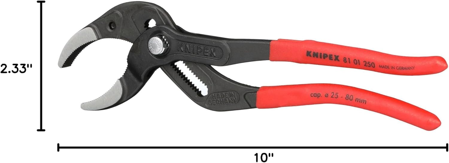 The only pipe and connector pliers in the market that offers 25 easy adjustment positions at the push of a button. Once this tool is set it stays in that position without movement until you change it, making it the ideal tool for repetitive work. The rounded jaws grab a hold of round pipes and connectors up to 3-5/32" diameter.