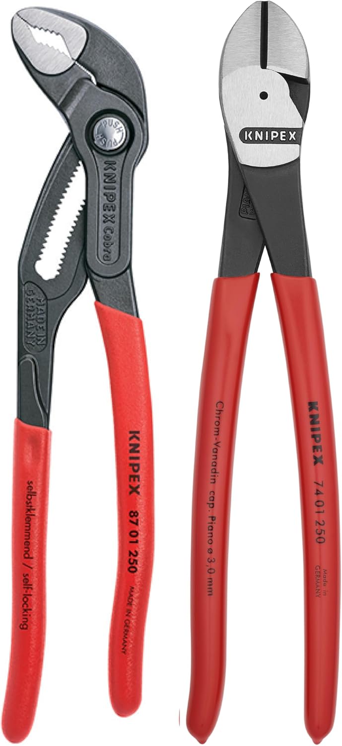 Knipex 9K 00 80 115 US Cobra water pump pliers and Diagonal cutters set with keeper pouch. The 87 01 250 Cobra pliers feature 25 adjustments positions with a capacity up to 2 inches for pipes, 1 13/64 inches for nuts. The 74 01 250 Diagonal cutters feature a cutting edge hardness of approximately 64 Hr and can accommodate these cutting capacities: 3/16-inch medium hard wire, 9/64-inch hard wire, and 1/8-inch piano wire.