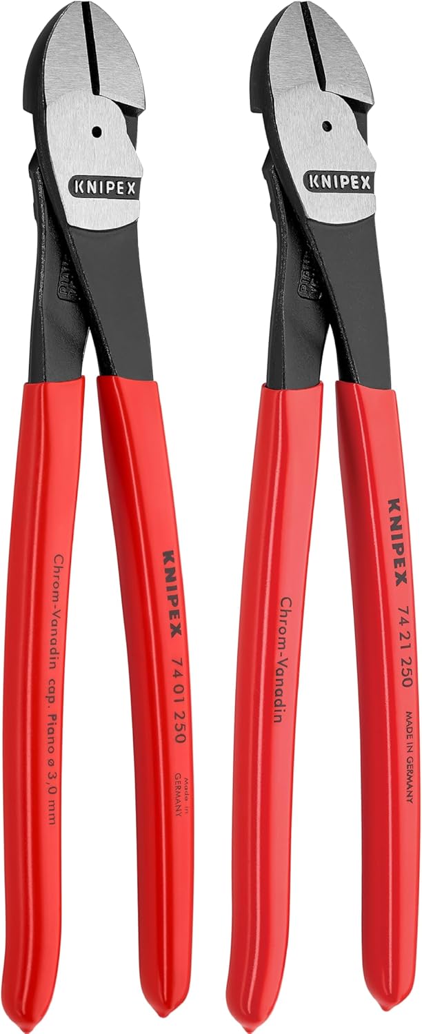 Knipex 9K 00 80 129 US, diagonal cutter 2-piece set suited for a variety of applications. Set includes 74 01 250 with straight head and 74 21 250 with 12-degree angled head. Cutting capacity: 3/16-inch medium hard wire, 9/64-inch hard wire, and 1/8-inch piano wire. Suitable for copper conductors up to 16 mm and aluminum conductors up to 35 mm.