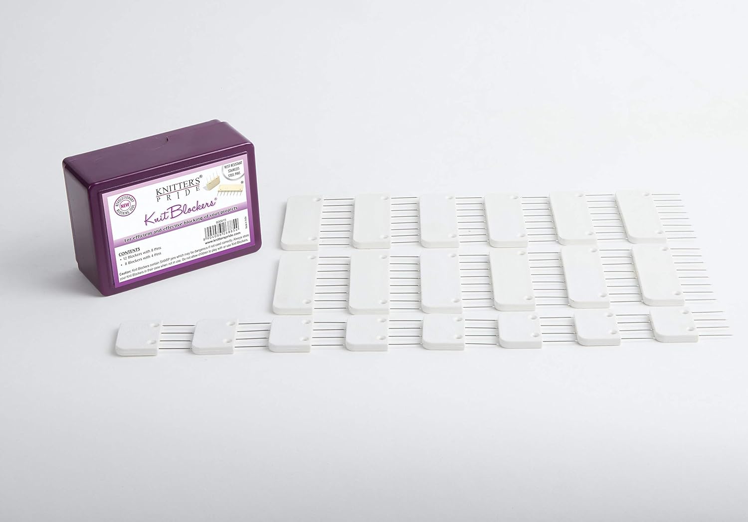 These innovative tools created by a clever knitter save time, reduce the number of pins needed to block a project and allow you to apply more consistent tension over a wider area. Knit Blockers can also be used with string or blocking wires to form straight or curved edges. Set includes 12 large (3-long) and eight small (1 1/2-long) blockers in a sturdy plastic storage case.