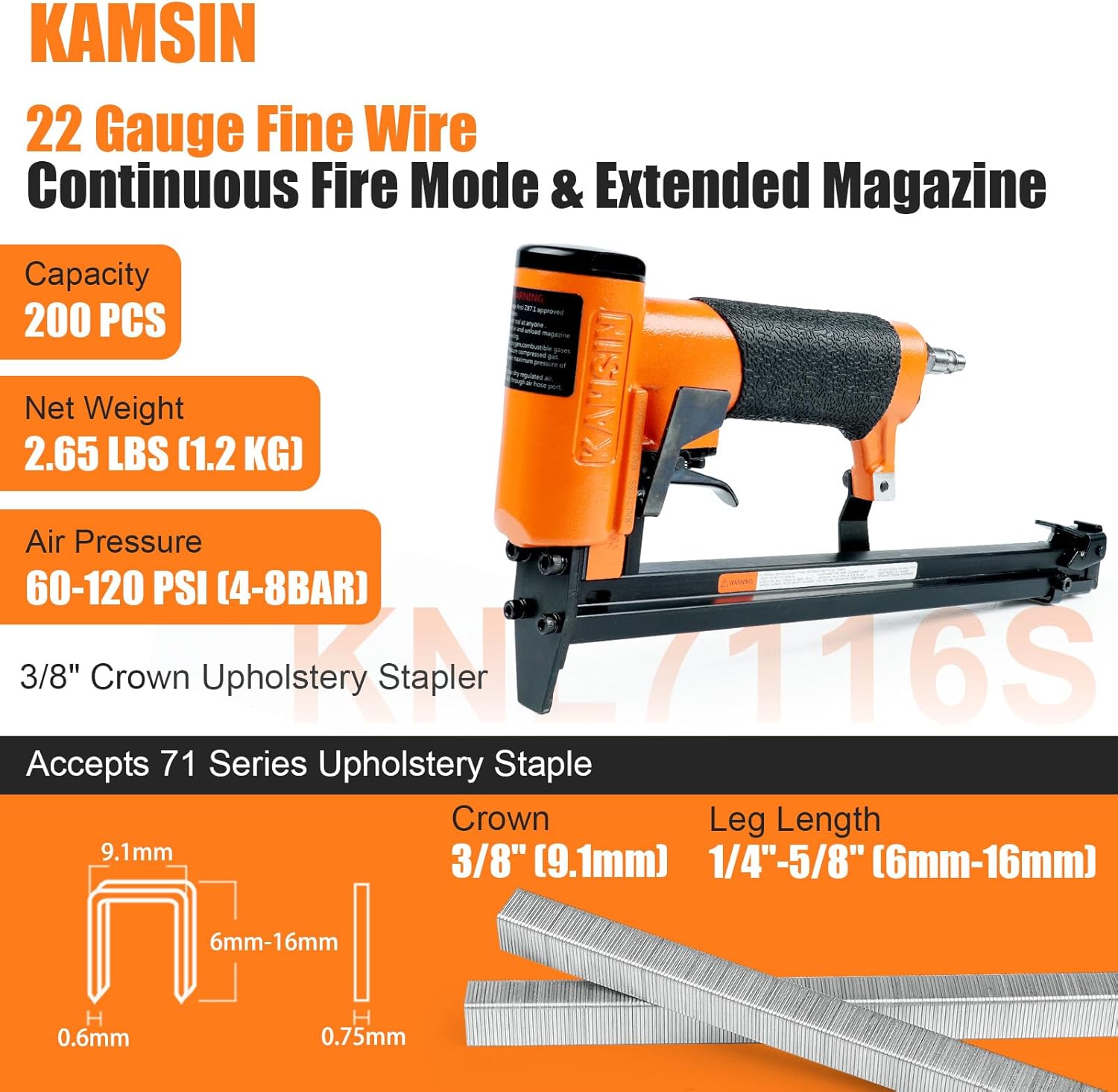 Bundle of Kamsin KNL7116S Pneumatic Upholstery Stapler and 7106 Staples Package Includes: Kamsin KNL7116S Pneumatic Upholstery Stapler x 1 Piece 3/8 Inch Crown 1/4 Inch Leg Length Galvanized 7106 Staples x 1 Box (10,000 pcs/box)