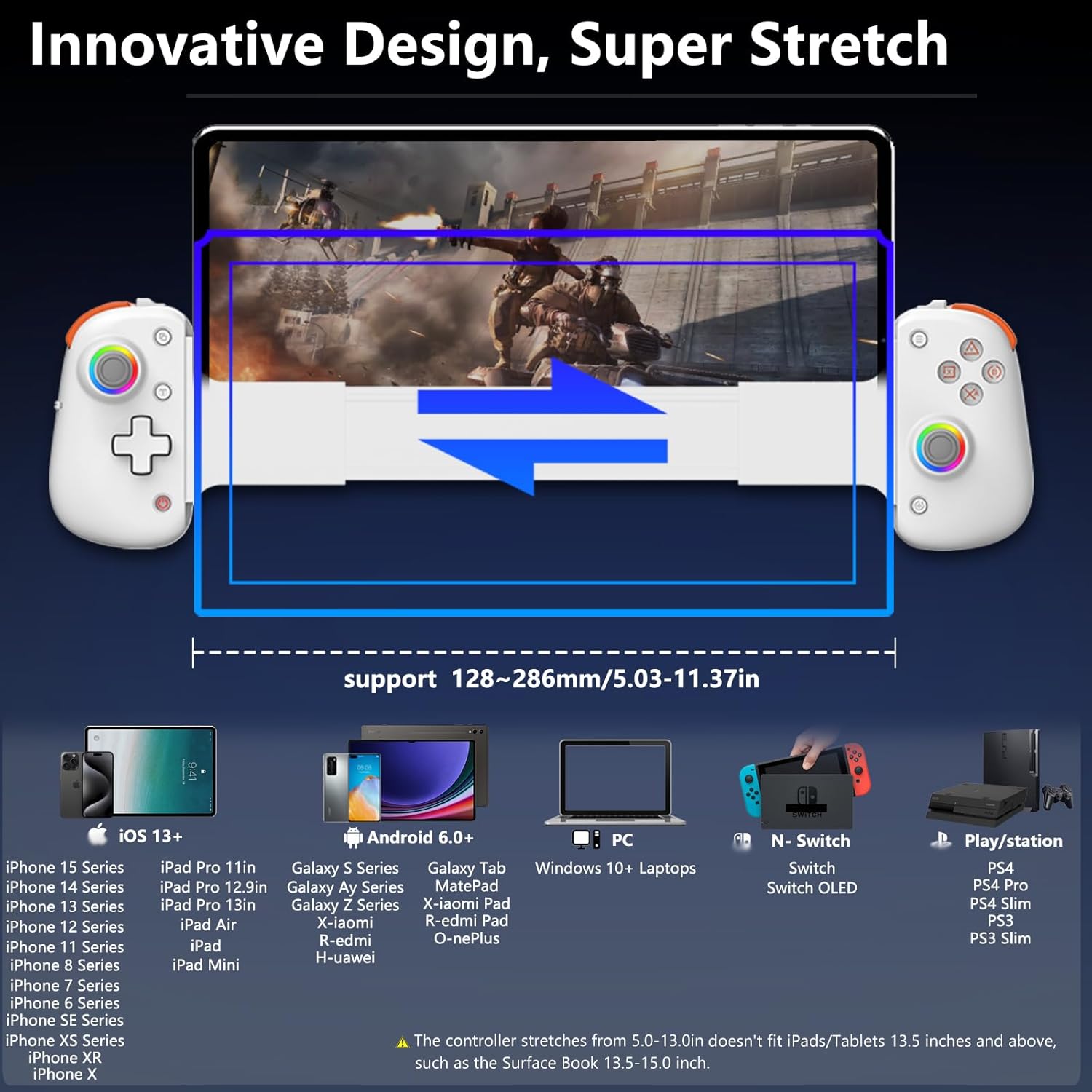 • IPAD/TABLET GAME CONTROLLER: Koiiko wireless gamepad compatible with iPad, Android tablet, Compatible with iPad air 5/4/3, iPad Pro 12.9in, ipad Pro 11 inch 4/3/2, iPad 10/9/8, iPad mini 6/5/4, Galaxy Tab S9 FE/S9/S8, Galaxy Tab A9+/A8, Lenovo Legion Y700 more-not for Galaxy Tab S 13-15in tablet/Lenovo Legion Y900; Compatible device size from 5-12.9inch [No need to disassemble the phone case for use]