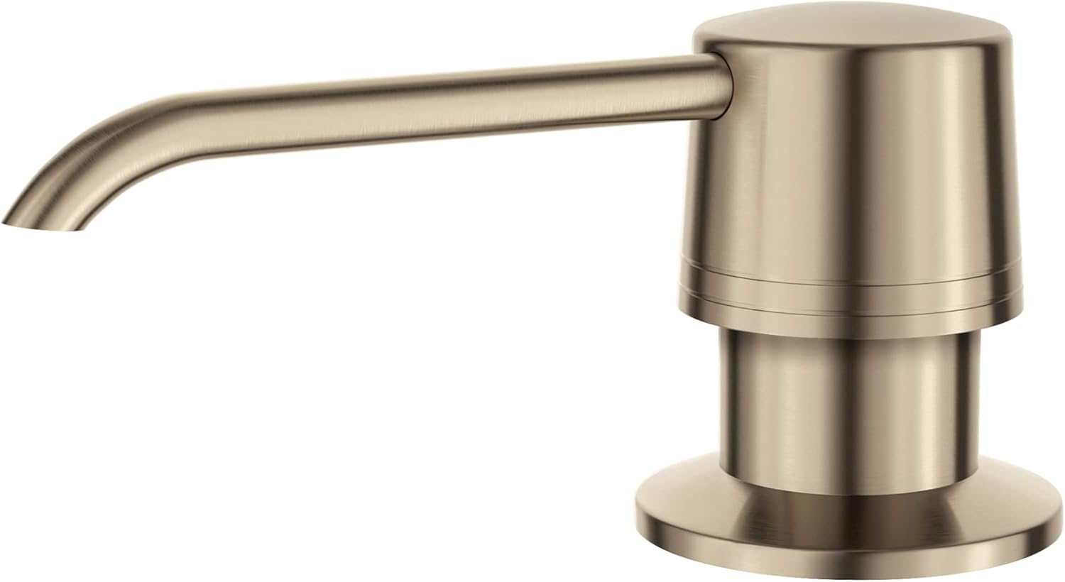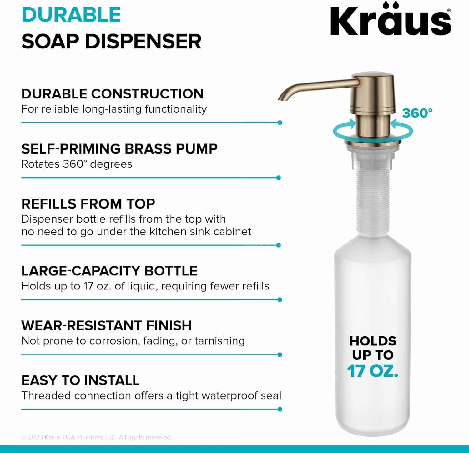 This easy-push self-priming soap dispenser with solid brass pump is the perfect complement for your kitchen faucet. The reservoir bottle holds your choice of liquid soap, lotion, or detergent, and refills from above the counter with no need to go underneath the sink. Designed to hold up to 17 ounces, the large-capacity bottle requires fewer refills. A threaded connection makes installation easy, with a tight seal that helps protect against leaks. The heavy-duty pump rotates 360 degrees so you can position the nozzle anywhere you need it. The universal design complements any decor style and coordinates with all Kraus faucets for a cohesive look. Available in a choice of corrosion-resistant finishes, including Spot-Free options that help prevent water spots and fingerprints.