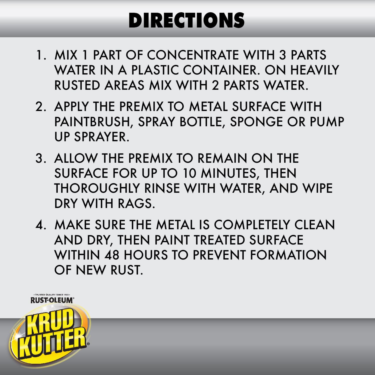 Save time on most paint projects by cleaning and etching all in one step. For heavily soiled surfaces the original krud kutter should be used as a pre-prep step, to remove excess oil, grease, and dirt. Excess rust should be removed with a wire brush. Krud kutter metal clean and etch is specially formulated to prepare iron, steel, zinc, aluminum, and galvanized surfaces for painting. Removes rust, oil, grease, and dirt. Eliminates paint peeling and other adhesion problems.