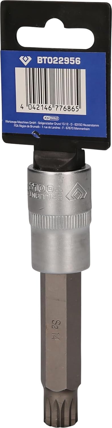Manufactured in accordance with DIN 3120 1/2" square drive (12.5mm) Made of high quality chrome vanadium steel for extra long life matte chrome Spline Profile, XZN M14 BRILLIANT TOOLS Spline Bit Socket BT022956 features a 1/2" (12.5 mm) square drive manufactured in accordance with DIN 3120. Pressured phosphate bits are size M14. Bit sockets are 5.5 inches (14 cm), blade length 4.0 inches (10.2 cm). Matte chrome plated on the surface of the drive and bit side with vertical knurling dividers. Drive-In Inch: 1/2" Total Length: 5.5 inches (140.0 mm) Weight: 4.2 oz (126 g) Profile Size Spline: M9 Drive In: 1/2" Total Length: 5.5 inches (140.0 mm) Weight: 7.5 oz (217 g) Profile Size Spline: M14