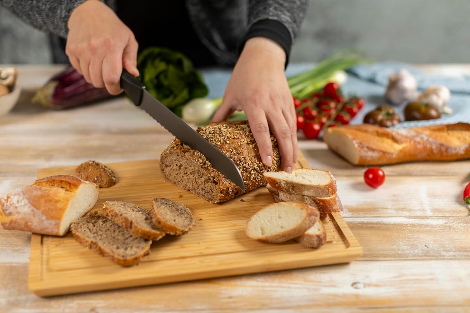 The Kuhn Rikon ICED Bread Knife is designed to deliver clean precise slices through crusty bread and soft interiors. The 7.87 inch blade is crafted from German stainless steel that is heated above 1000°C and then ice hardened at minus 120°C. This process strengthens the blade structure and creates a sharp durable serrated edge. A titanium coating adds durability and helps maintain consistent cutting performance. This bread knife is ideal for slicing loaves rolls pastries and other baked goods with control and ease. Its clean Swiss inspired design and reliable performance make it a practical everyday tool in the kitchen. For best results and long lasting blade performance, hand wash only.