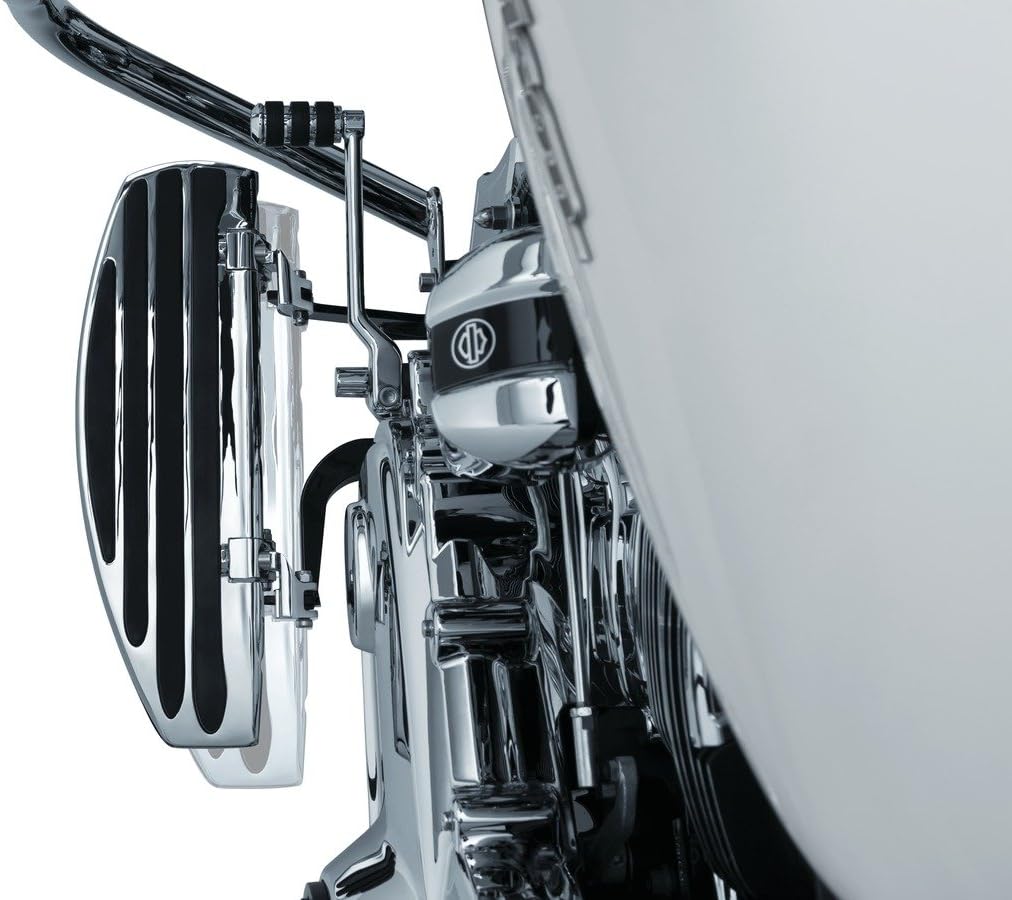The Kuryakyn 4609 driver floorboard relocation brackets allow you to reposition the driver boards out 1" and forward 1" from the stock location. Gain more room for your thighs, right knee and your legs; provides a noticeable difference in comfort. Durable designed with a chrome finish; for use with Kuryakyn ISO boards and Harley-Davidson traditional or SweptWing shaped boards. Includes (1) left front bracket, (1) left rear bracket, (1) right front bracket, (1) right rear bracket, and (1) hardware kit; suggested for installation (not included): set of hex wrenches and combination wrenches. The Kuryakyn 4609 driver floorboard relocation brackets are compatible with Harley-Davidson models: '17-'19 Electra Glides (excludes '17-'19 FLHTKSE), Road Glides (excludes '18-'19 FLTRXSE), Road Kings, Street Glides (excludes '17-'19 FLHXSE) and '17-'19 Trikes.