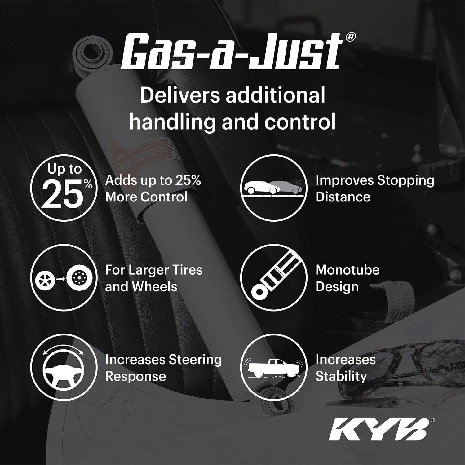 The KYB Gas-a-Just monotube shock absorber has additional performance advantages over the traditional twin-tube design: It can instantly, automatically adjust to your performance needs and never experiences fade due to aeration. The Gas-a-Just is available as an OE monotube replacement and as an OE twin-tube performance upgrade. The KYB Gas-a-Just has two separate working chambers: An air-free hydraulic piston and valve area for responsiveness & control, and a second high-pressure nitrogen gas area with a floating piston that provides a comfortable ride during normal driving and adds instant performance on demand.