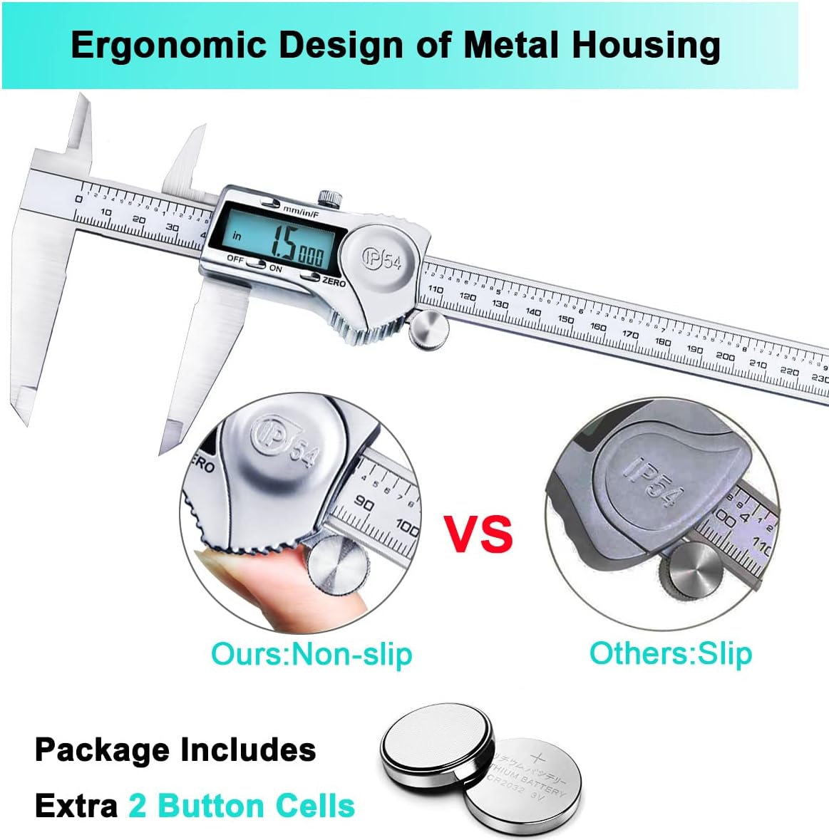 Do you want a quick and precise digital caliper? Our caliper gives you the certainty you need. It gives you four different ways to find those tricky dimensions, and no longer need to struggle with tiny and inaccurate numbers on your analog caliper or other measuring device. Product Features Premium Material Heavy duty waterproof stainless-steel body, dust protected and splash water resistant. Accurate Reading Strictly tested to ensure exact measurements accurate to ±0.001”/0.02 mm. Zero Calibration Press to set to zero at any position to measure the next section Auto Shut-Off Auto turn-off after about 6 min of inactive operation. Notice If you find the readings are not accurate, please slide the LCD screen to the left end (“0” on the scale), and then press the zero button
