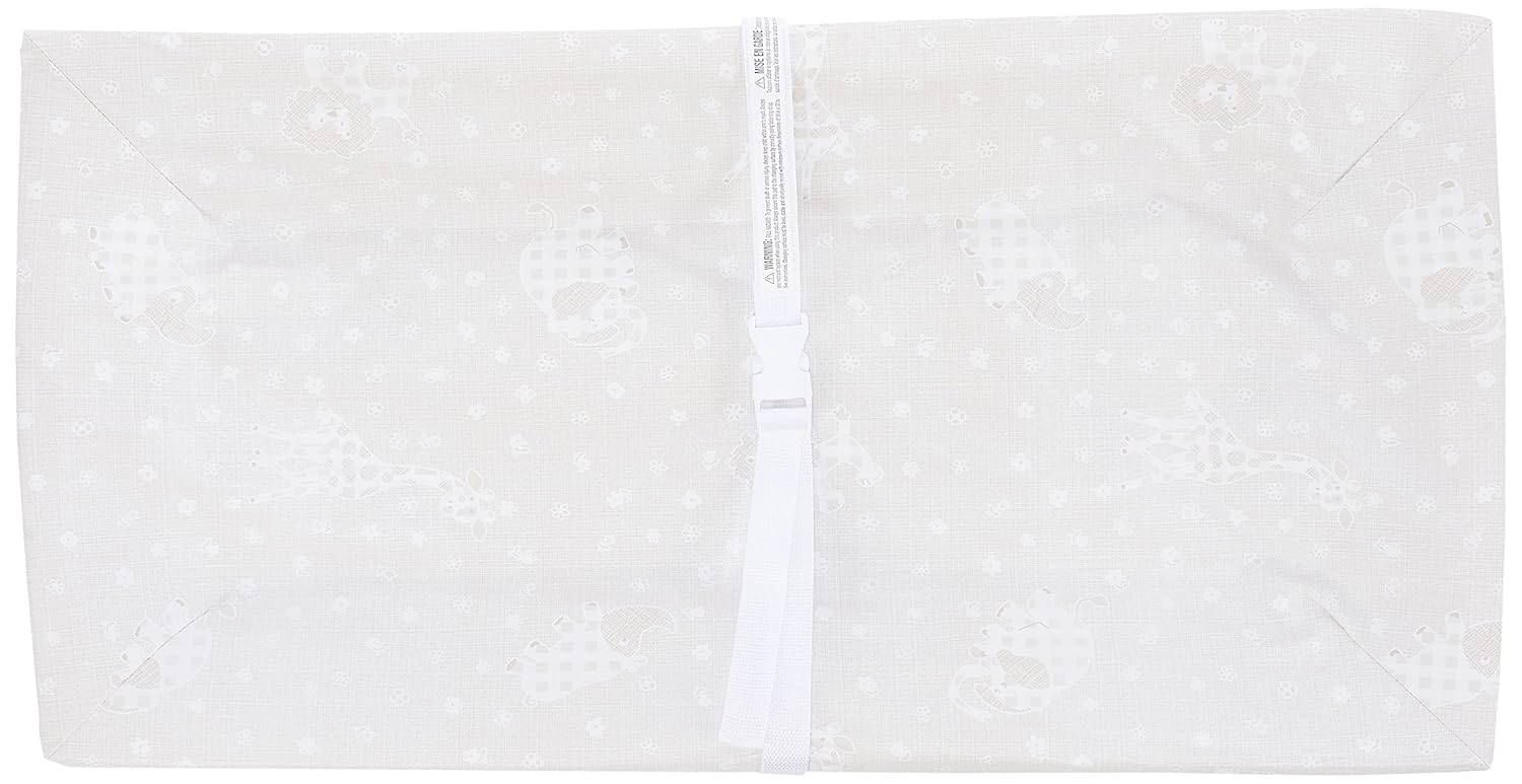 LA Baby 32" 4 sided square corner changing pad in a light tan Savannah print cover has two 4" high sides to keep baby safe and has an overall size of 32" x 16" x 4". Our playful Savannah baby animals in a light tan color is printed on a vinyl cover that is waterproof, phthalate free, non-toxic, non-allergenic, stain resistant and easy to keep clean with mild soap and water. Polyester fiber-fill provides support during diapering time. Features a non-skid bottom that prevents pad from sliding while changing baby. Safety harness for baby with a quick release buckle. Includes security strap for holding changing pad to changing table or dresser top. Proudly made in the U.S.A from domestic and imported sources. 1 year warranty.