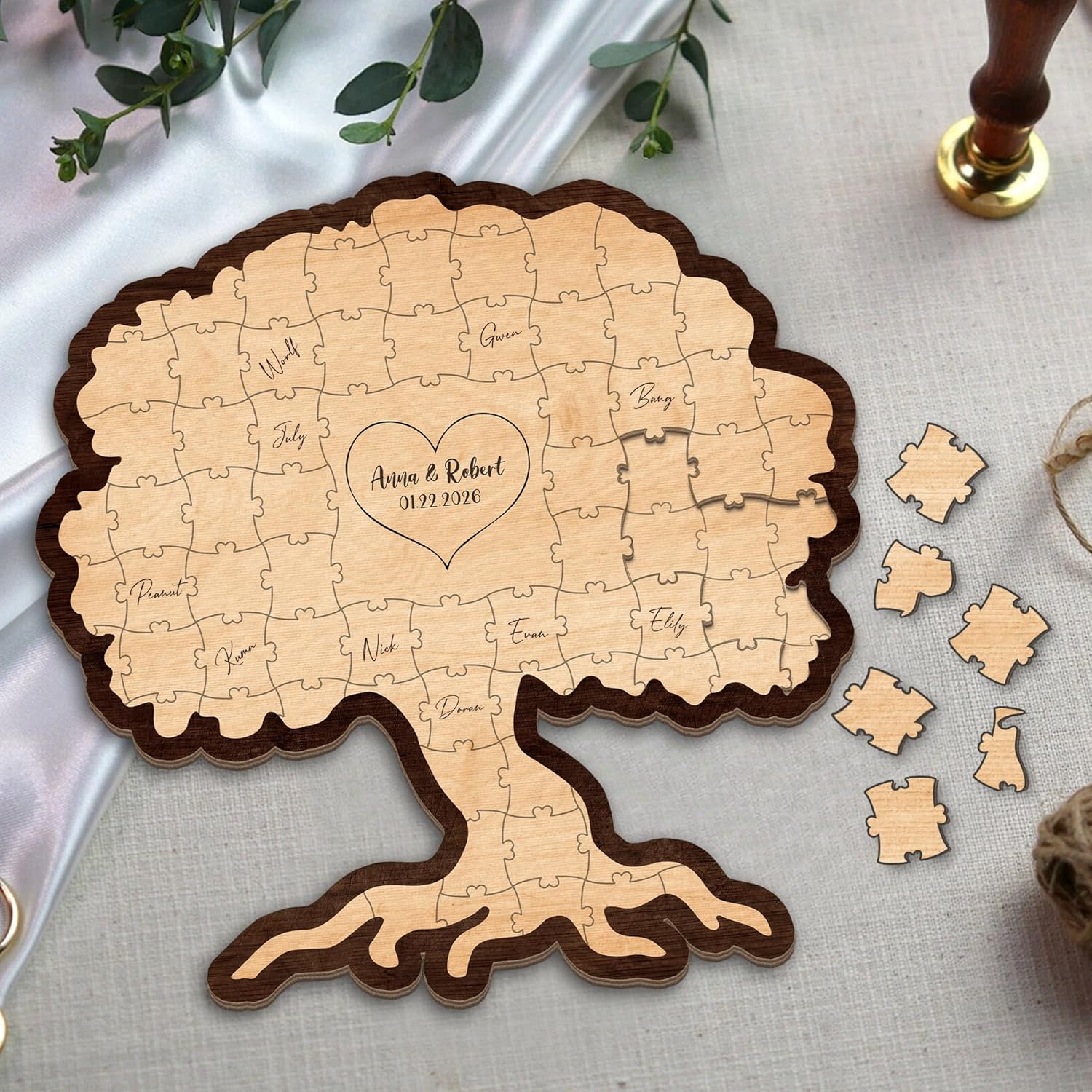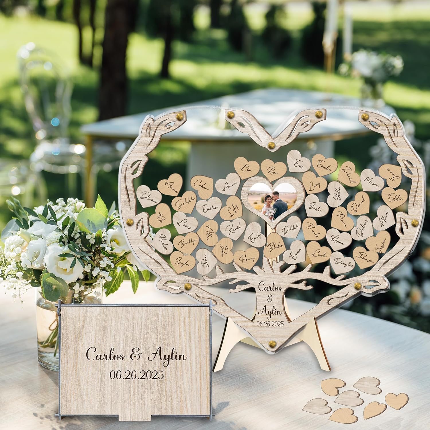 Turn your wedding memories into a work of art with this Personalized Wedding Guest Book Alternative.Designed for couples who want something more meaningful than a traditional guest book, this wooden guest book tree invites guests to sign individual wooden chips and drop them into the frame—symbolizing love, wishes, and shared memories from your special day.Crafted from natural wood and premium acrylic, each piece features a smooth glossy finish and exceptional durability. The layered design creates depth and elegance, making it a stunning décor piece for your wedding welcome table and a lasting keepsake for your home.Available in multiple sizes from 12 to 24 inches, this guest book set is fully customizable with your names and wedding date. Whether your style is rustic, boho, modern, or classic, it blends beautifully with any wedding theme.What’s Included:Personalized wooden guest book boardEngraved wooden signing chipsCustom wooden chip storage boxSolid wooden display standCelebrate love, capture memories, and create a keepsake you’ll treasure forever.