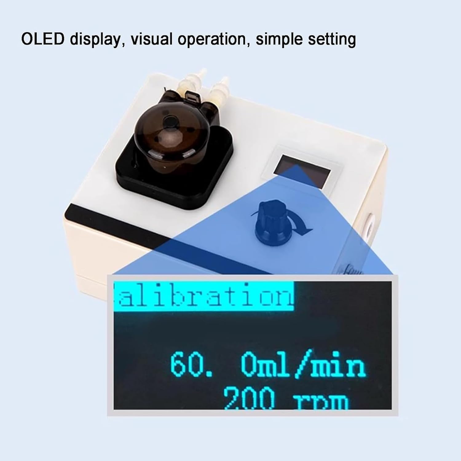 Accurate flow rates, easy maintenance, and the ability to adjust the speed during pump operat. Specification: Display screen: OLED Calibration: Set the amount of liquid discharged per minute Quantitative: Timed output of a set volume of liquid Timing: Timed output of a set time of liquid discharge Manual mode: Manual mode that can display the liquid discharge time and volume Power-off memory: Supported Control mode: Knob/pedal Pump tube material: BPT Pump tube size: 2*4 Flow range: 0-40ml/min Products include: 1*Stepper peristaltic Pump Rated voltage (appliances or chargers): AC110-240/50HZ;