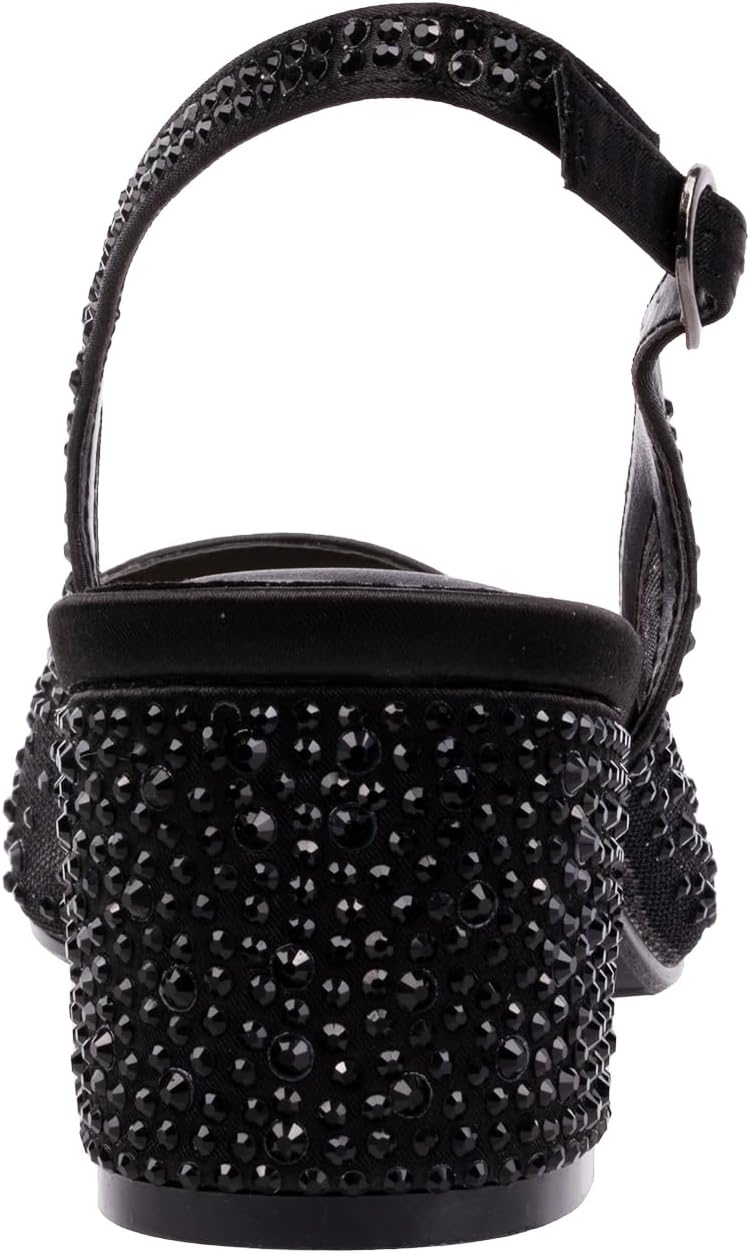 Scattered rhinestones on our translucent mesh slingback gives a delicate look to our sturdy buckle slingback. Low square block heel is embelished with rhinestones for your special occasion.