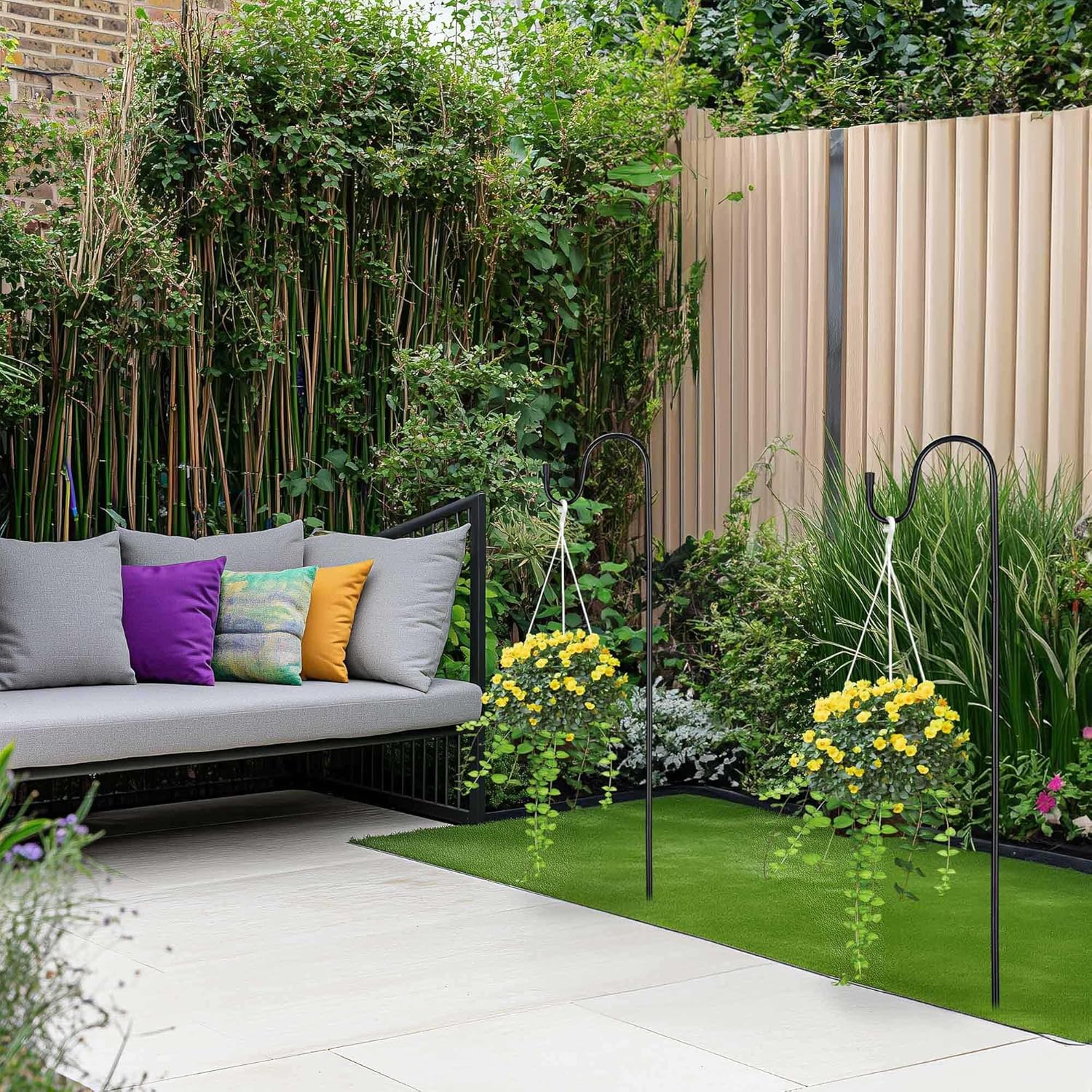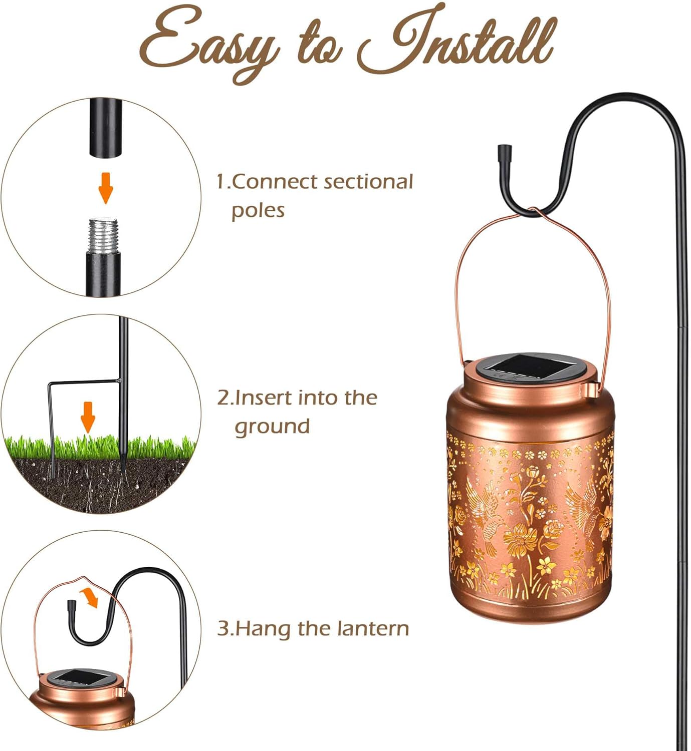 Features:- Versatile Usages - Set of 6 Shepherds Hooks for Outdoor features solid steel construction with powder-coated finish, hanging a variety of items such as flower baskets, bird feeders, plants, garden lanterns, windchimes- Adjustable Height - Allows for multiple heights by splicing different numbers of poles together, creating ideal display of lantern or plants to your needs- Premium Quality - Made from heavy-duty powder-coated steel, the shepherds hook withstands harsh weather conditions and ensures durability for years to come- Easy to Use - Simple to assemble without any tools, and features a 2-prong base that securely stabilizes it in the ground- Lantern Hangers - Suitable for hanging our LAGarden Morris' Bird/ Mush's Room Solar Lanterns with model number: LAG001, LAG002, reach out to Customer Service for helpSpecifications:- Overall Dimension(LxWxH) 7 1/16" x 3/8" x 31 1/2" (18 x 1 x 80 cm)- Top Pole Size(LxWxH) 5 7/8" x 3/8" x 7 7/8" (15 x 1 x 20 cm)- Middle Pole Size(Dia.xH) 3/8" x 7 7/8" (1 x 20 cm)- Bottom Pole Size(LxWxH) 2 3/8" x 3/8" x 7 7/8" (6 x 1 x 20 cm)- Material Metal- Net Weight 2.9 Lbs (1.3 kg)Package Contents:- 6x Top Poles- 6x Middle Poles- 6x Bottom Poles