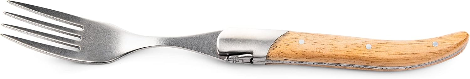 The Laguiole Style de Vie Luxury Line forks are made of stainless steel and oak wood. The set contains 6 pieces. The forks have a thickness of approximately 0.1 inches and are made of high quality stainless steel. The back of the handle is beautifully decorated and can be recognized by the bee. The forks from the Luxury Line have a total length of 8.66 inches. The Laguiole forks are delivered in a beautiful black wooden box. The forks are not dishwasher safe. Laguiole is not a registered brand or trademark. The word "Laguiole" is a general term, not legally restricted to a single company or place of manufacture. Laguiole Style de Vie products are made in China with very high quality standards.