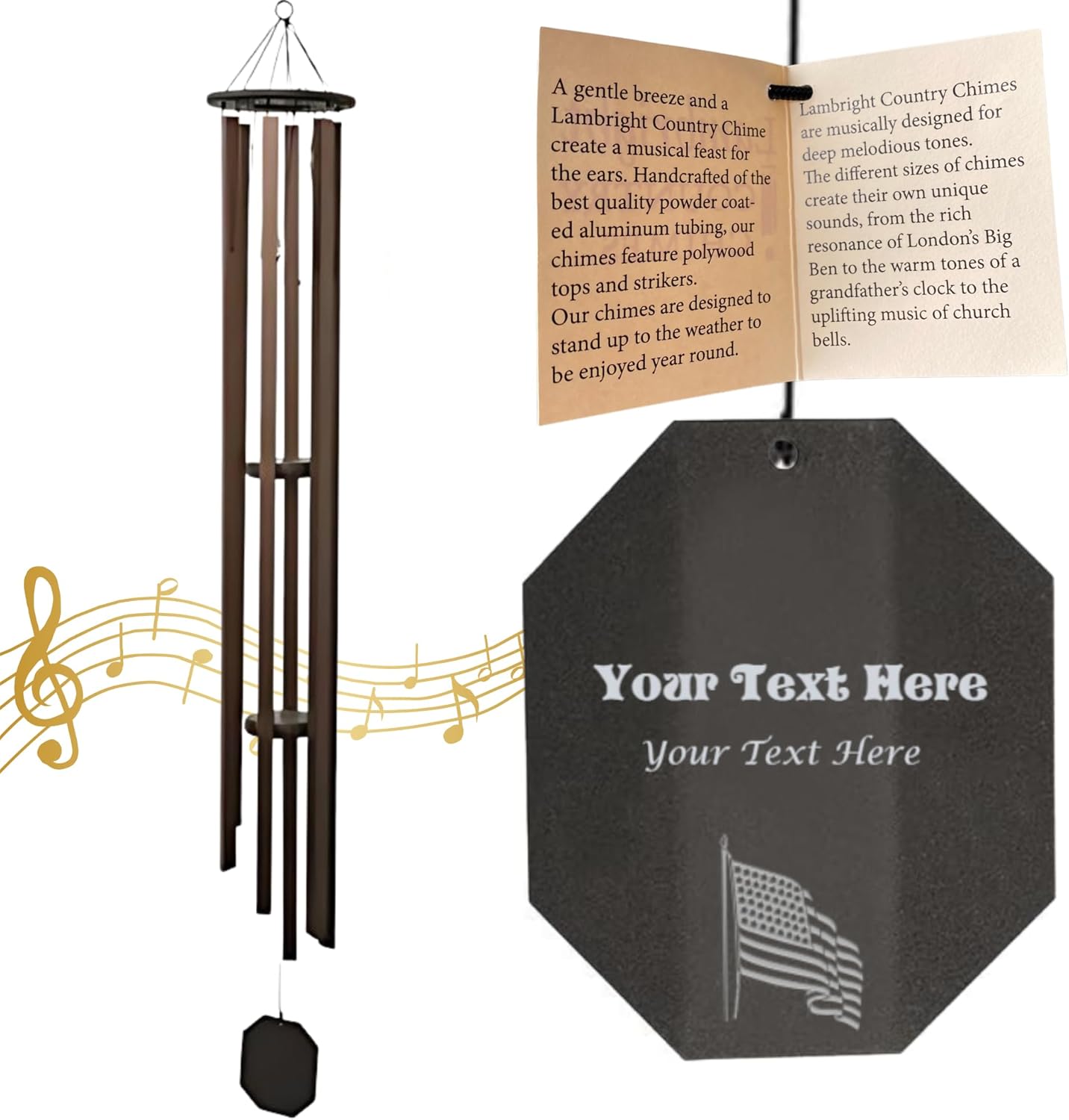 Lambright Country Chimes designs their Pacific Winds Series wind chimes to be suitable for any garden, patio, balcony, yard, beach home, or even a decorative room decor accent for indoors. As the wind glides through the aluminum tubes, it produces soothing sounds of an ocean breeze and a mountain serenade to the rich, deep tones of a grandfather clock. Listen to these beautiful songs from inside or outside, as the wind chimes promote feng shui, relaxation and help you reconnect with nature! Wind chimes beautifully complement your backyard, deck, porch or pool area. Provides security when affixed to doors, alerting homeowners of any entry. Wind chimes provide a weather indicator, sounding when the wind picks up. Entertaining for small children, retirees, and seniors. Helps to keep birds from flying into your window as the tones will keep them at bay. The wind chime tops and strikers are made from eco-friendly poly lumber that consists of recycled milk jugs. The chime string is polyester and is UV treated to withstand long sun exposure. Aluminum chime tubes are powder coated which bakes the color onto the aluminum, making it durable and more resistant to weather. Remember your loved ones with an etched symbol or initial letters of their names, birthdates, anniversary dates. Choose from popular images like a hummingbird that represents luck, a cardinal which symbolizes love, or a butterfly known for life changes and growth. Pick a paw print for a pet loss and a sign of remembrance of your furry friend. Select an American flag, angel, or soldier for fallen heroes in the military, army, navy, or coast guard. Great home decor gifts for dad, gifts for sister, gifts for boyfriend, anniversary gifts for couple, moms, mothers, or best friend. Best presents for wife, best gifts for women over 60, unique gifts for women, or just womens gifts. Customizable gifts are an excellent choice for any occasion. What are you waiting for? Bring soothing sounds to your home today!