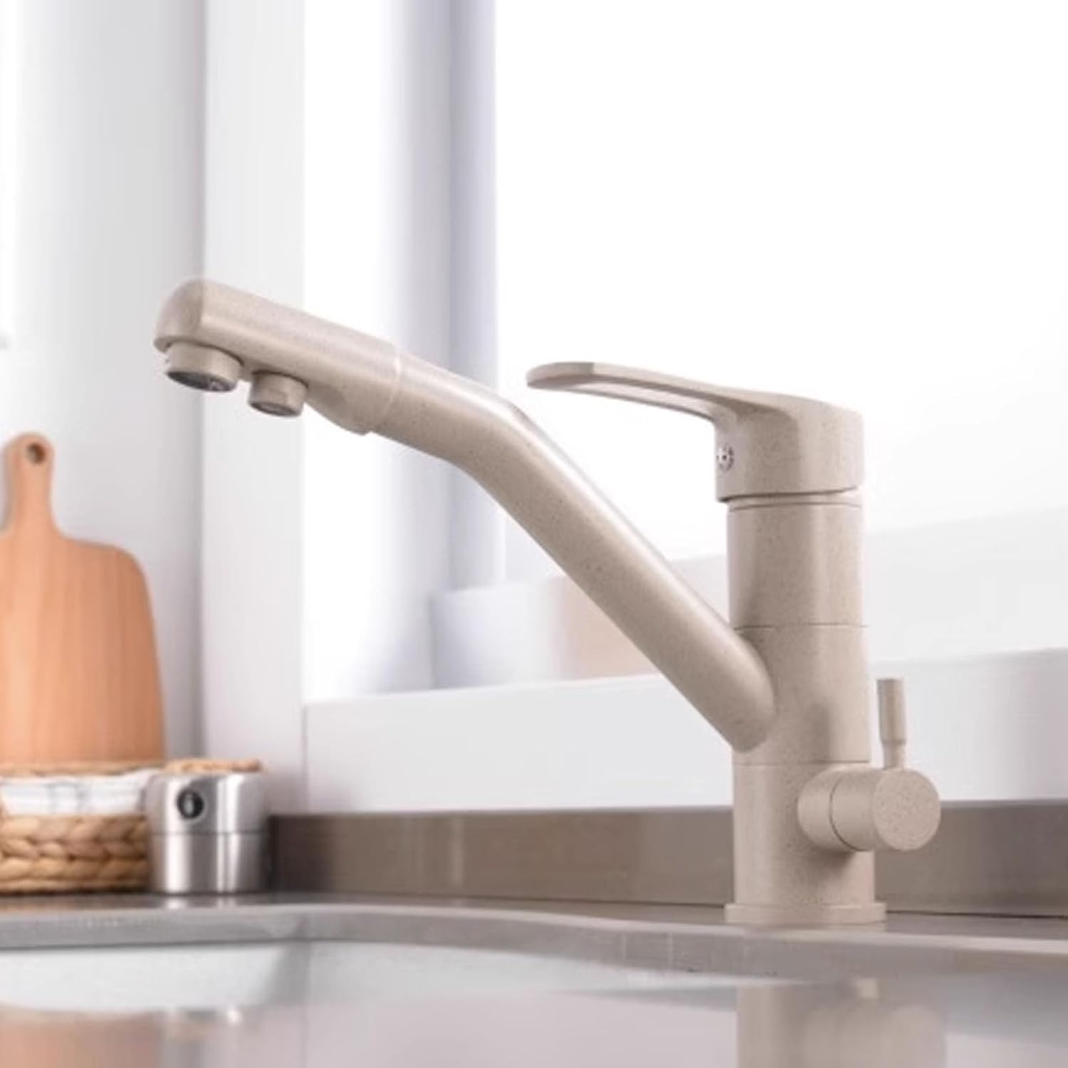 Technical data:- In original packaging.- Faucet type: 3-way faucet for osmosis system.- Installation type: Center-mounted.- Material: Brass.- : Beige granite.- Valve type: Ceramic valve.- Number of handles: Two handles.- Number of holes: One hole.- Mixing of tap water and drinking water.About the drinking water function:- 1. Universal two-lever mixer tap suitable for multiple water filter systems.- 2. Two outlets, one for cold and hot water, the other for filtered water, for clean drinking.Features:- Low guide rail, refined copper, gravity casting, third-degree polishing, beige granite.- The nozzles are very fine, so the water jet is ed evenly, without splashing or noise. - Premium ceramic cartridge tested 600,000 times, waterproof and heat-resistant, durable.- DIN standard 3/8-inch, standard stainless steel connector, safe to use.Package Contents:- 1 faucet.- 3 flexible connection hoses.- Fixing materials.We are committed to ensuring complete ion. If you have any damage or quality issues after receiving the product, please at any time.