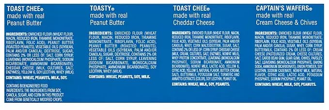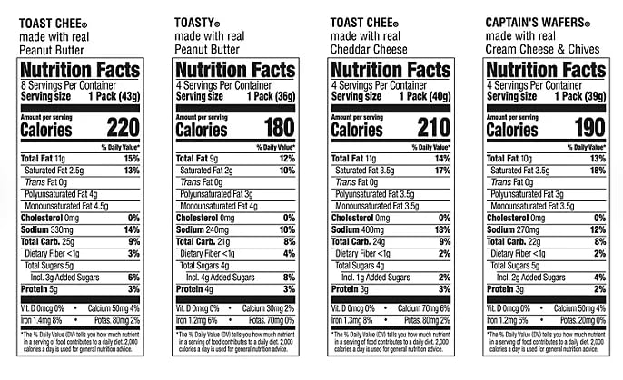 40 individual packs, 6 sandwich crackers per individual pack Flavors include: 18 - ToastChee Peanut Butter, 8 - Toasty Peanut Butter, 8 - ToastChee Cheddar Cheese and 8 - Captain's Wafers Cream Cheese and Chives Fresh Baked Crackers And Tasty Fillings: Made with real peanut butter or cheese Great Anywhere Snack: Take these convenient packs with you on the go, or keep handy whenever you need a perfectly portioned snack