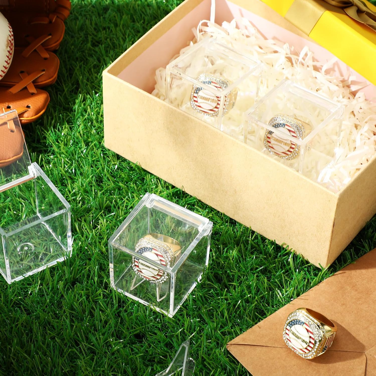 Features: Multiple uses: Our championship ring display case can not only hold championship rings, but also small toys, jewelry, coins and other items you want to collect. Our baseball championship ring is not only a finger decoration, but also can be worn as a necklace with a chain. With our matching ring case, it can also be turned into a desktop decoration at home or in the office. Ideal gift: This championship ring display case is a good choice for family, friends, sons, grandsons, teammates, and colleagues. Anyone who loves sports will love it. It is a good choice for collectors who want to display their precious collections anytime, anywhere. Specifications: Material: alloy, acrylic Color: gold, blue, red, white, black Size: Inner diameter of baseball championship ring: 0.83 inches/ 21 mm Display box: 1.97 x 1.97 x 1.97 inch/ 5 x 5 x 5 cm Display stand height: 1.41inch/ 3.6cm Package includes: 1 x Baseball ring 1 x Ring display case 1 x Display stand Notes: Manual measurement, please allow slight errors on size. The color may exist a slight difference due to different screen displays