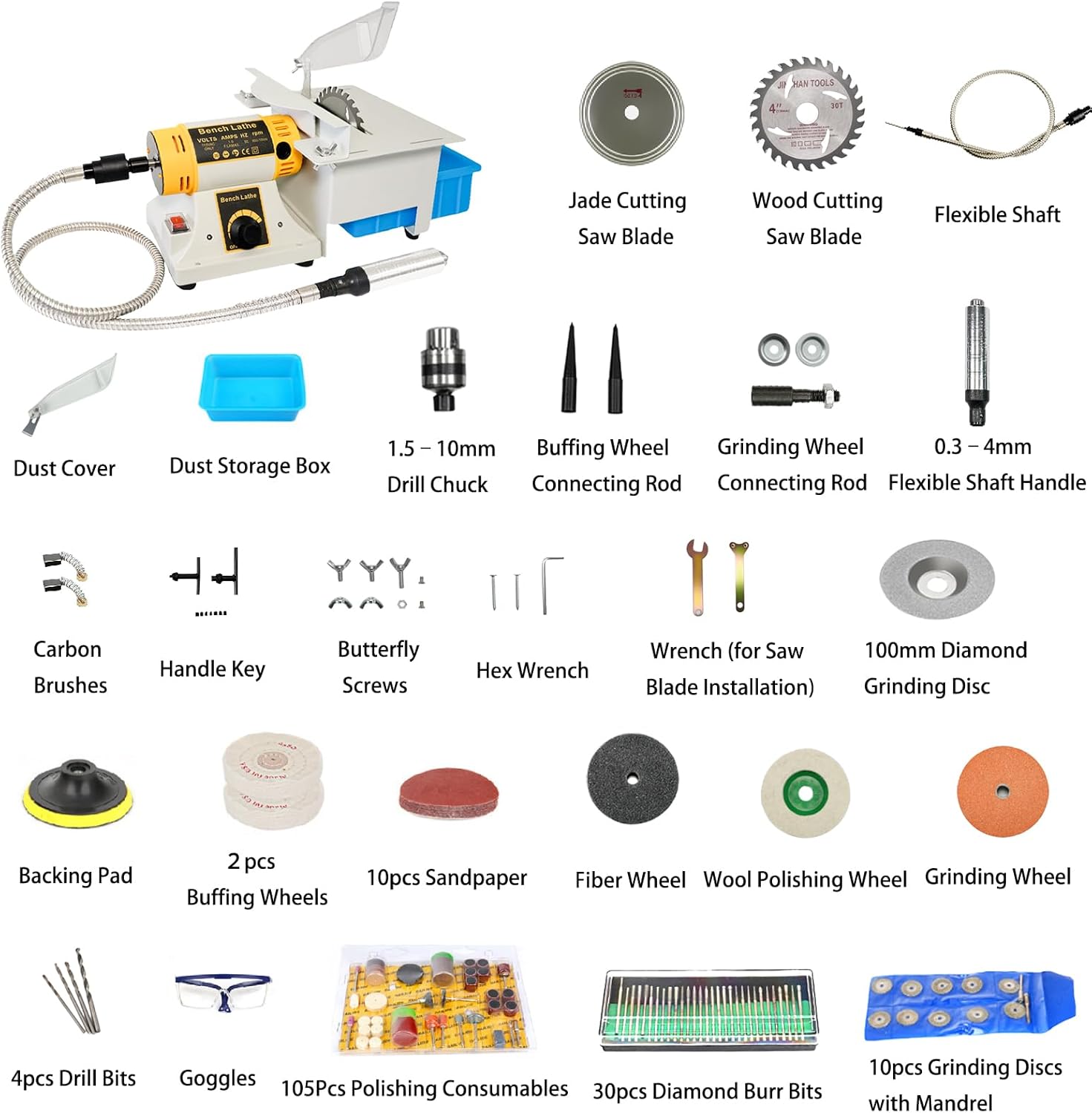 One Compact Machine, Multiple Functions Perfect for lapidary beginners, this mini rock saw integrates cutting, grinding, polishing, and drilling functions in one compact table unit. Shape, smooth, and finish your stones and crafts effortlessly. Complete Polishing & Grinding Kit Includes diamond burrs, sanding wheels, grinding discs, and drill bits—everything you need to polish jade, agate, wood, and beeswax. The flexible shaft offers extended reach for fine engraving and detail work. Powerful 750w motor with adjustable speed up to 10,000 RPM Stable, low-vibration platform for smooth operation Extended accessory kit for jade, agate, beeswax, wood, and more Flexible shaft + drill chuck for polishing, engraving, and fine detailing Clear blade guard + safety goggles for safer cutting and polishing Dedicated on/off switch to prevent accidental startups Perfect for lapidary beginners, hobbyists, and DIY artisans Whether you’re cutting jade, grinding wood, or polishing wax, this 5th-generation lapidary saw delivers powerful performance in a space-saving design. Start your gemstone crafting journey with one powerful, beginner-friendly tool. From rough rock to polished shine, this machine brings your creativity to life.
