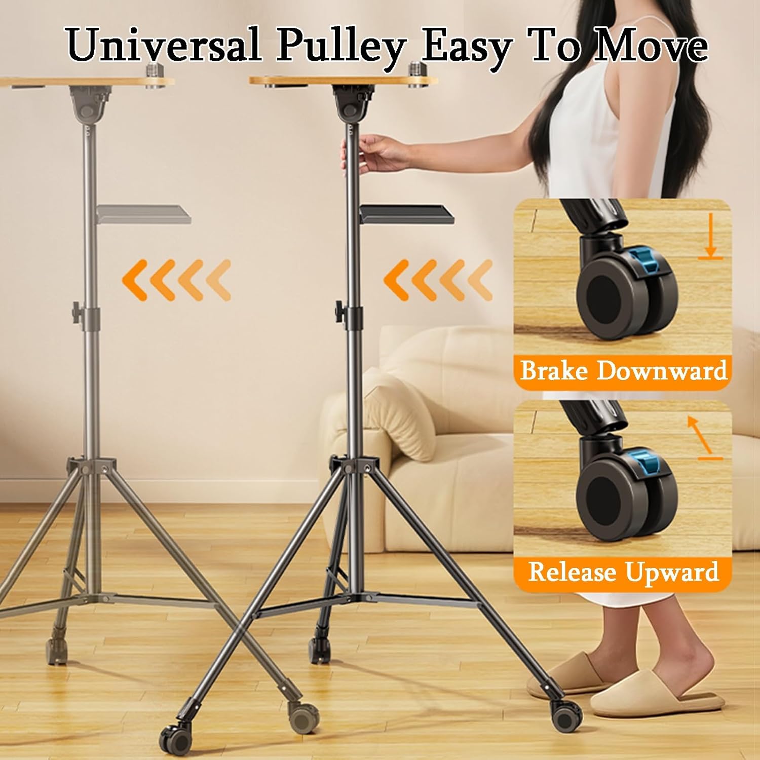 The laptop floor stand made of aluminum alloy and wood uses the triangular principle and has a stable structure. The liftable support column can be extended from 82cm to 145cm, and the board can be adjusted at multiple angles. Equipped with 3 360-degree free-rolling casters, bringing you convenienceFeatures:1. Made of aluminum alloy and wood, sturdy and stable2. Can be raised and lowered, adjustable at will3. Add rollers for easy movement4. Easy to assemble and clean, easy to use5. Widely used in homes, offices and indoor and outdoor placesSpecifications:Product name: laptop floor stand/ projector standMade of: aluminum alloy and woodColor: blackSize: as shown in the pictureAdjustable height: 82-145cmApplicable scenarios: suitable for homes, offices and indoor and outdoor placesPacking list:1 x laptop floor standWarm tips:1. This product only includes laptop floor stand, not other decorative props in the picture2. Due to manual measurement, the actual size may have an error of 1-2 cm. Please refer to the actual product3. Due to different computer monitors or lighting effects, the actual color may be slightly different from the picture on the details page. Please refer to the actual product