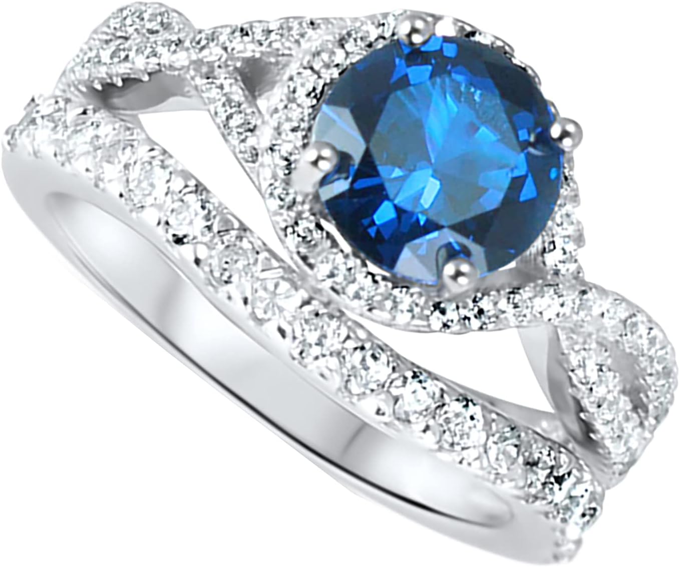 The bridal ring set for her is a two piece wedding and engagement ring set created in platinum plated 925 sterling silver. This antique style wedding set for women features a 1.5 carat round cut dark blue simulated sapphire center stone in a vintage inspired infinity halo setting and paired with a gently sculpted guard style matching CZ wedding ring genuine 925 sterling silver wedding ring for him with this TRIO his and her set. His ring has pave set simulated diamond stones that encircle the ring perfectly matching the style and design of his and hers WEDDING SET This vintage inspired His and her wedding set looks like a family heirloom Designed for the modern couple who appreciate style, quality and value this gorgeous TRIO sets proves you can honor your love and celebrate your marriage without going into debt.