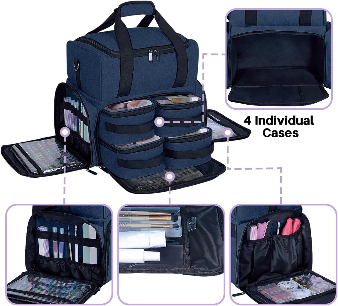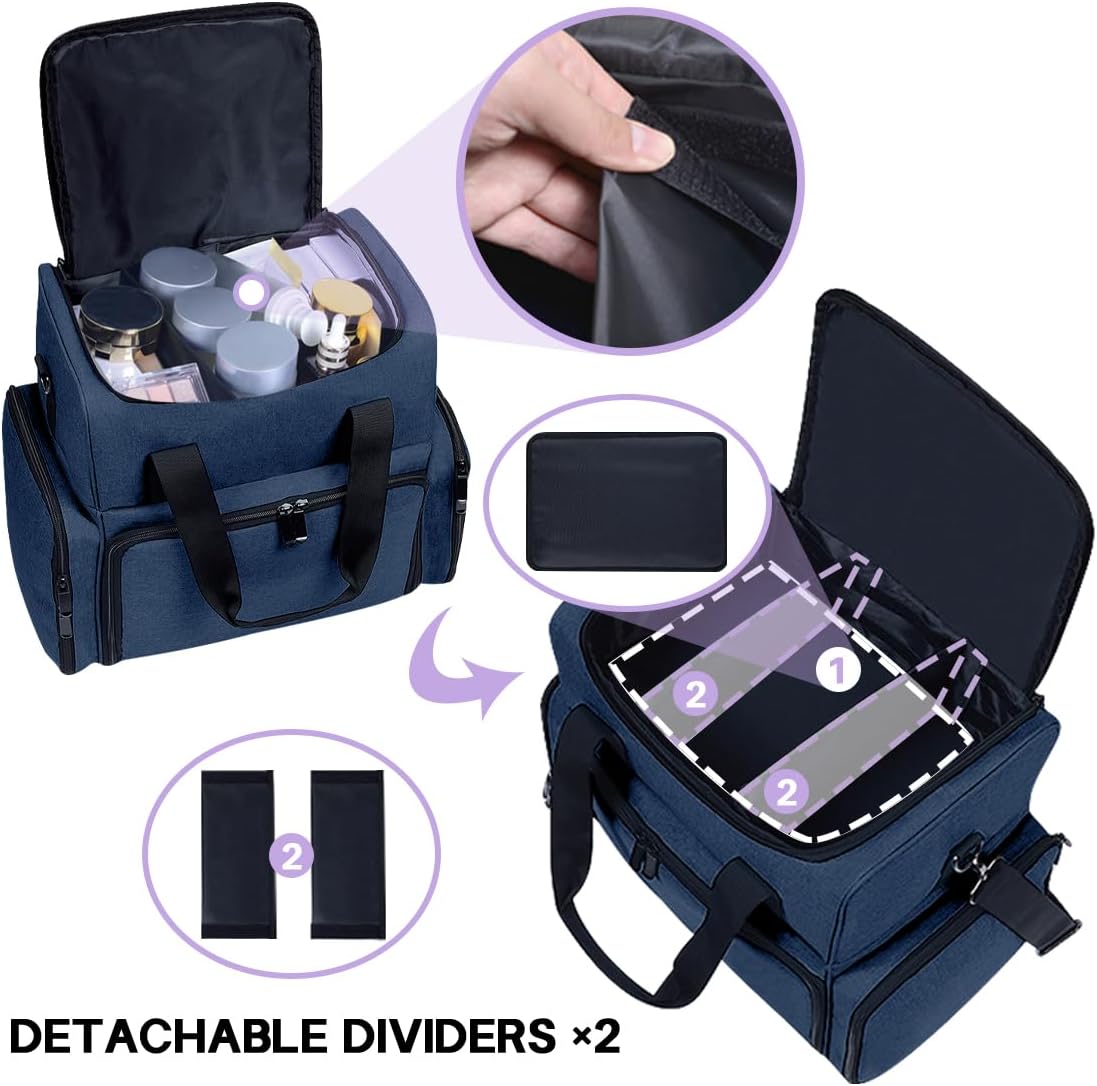 LANDFOBO Large Cosmetic Bag with 4 Removable Case Double Layer Travel Organizer Makeup Bag with Inner Dividers and Makeup Brushes Storage SectionBeautiful ColorsThis large makeup bag comes in 7 colors to choose from, which are very attractive and clean. It has two deep front pockets that can hold any large item, hair dryer, iron, makeup bag, top or bottom. There is enough space on both sides to store bottles, and there is elastic band for brushes, combs, and razors4 Individual CaseThe whole bag size:15.74*9.05*13.38.Size of 4 detachable small bags: 9.05 * 5.9 * 3.74. Each case designed with clear window for easy to find items at a glance and can be used individually. There is a transparent zipper pocket at the zipper of the makeup bag for storing samples or small itemsA Good Place for Small ItemsThe side zipper compartment is equipped with 6 deep slots and 2 open pockets. At the same time, there is a visual zipper pocket at the zipper, which can accommodate different sizes of makeup brushes, lipstick, masks and cosmetics necessitiesMultiple Modes of TransportationPackage style top handle, adjustable and padded shoulder strap, and rear luggage strap, making it convenient for you to carry your makeup bag to parties, travels, weddings, fashion shows, bathrooms, or campsites