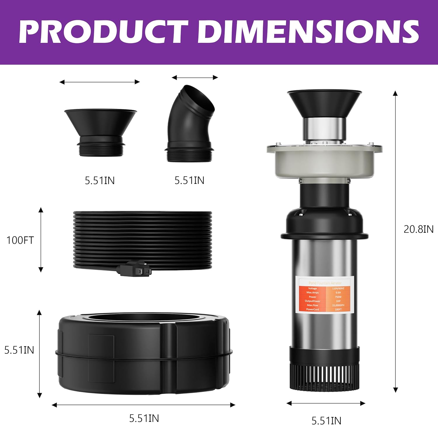 | Included Components | Energy-Efficient 1HP Professional Pond Aerator with 5-Color RGB Lighting |