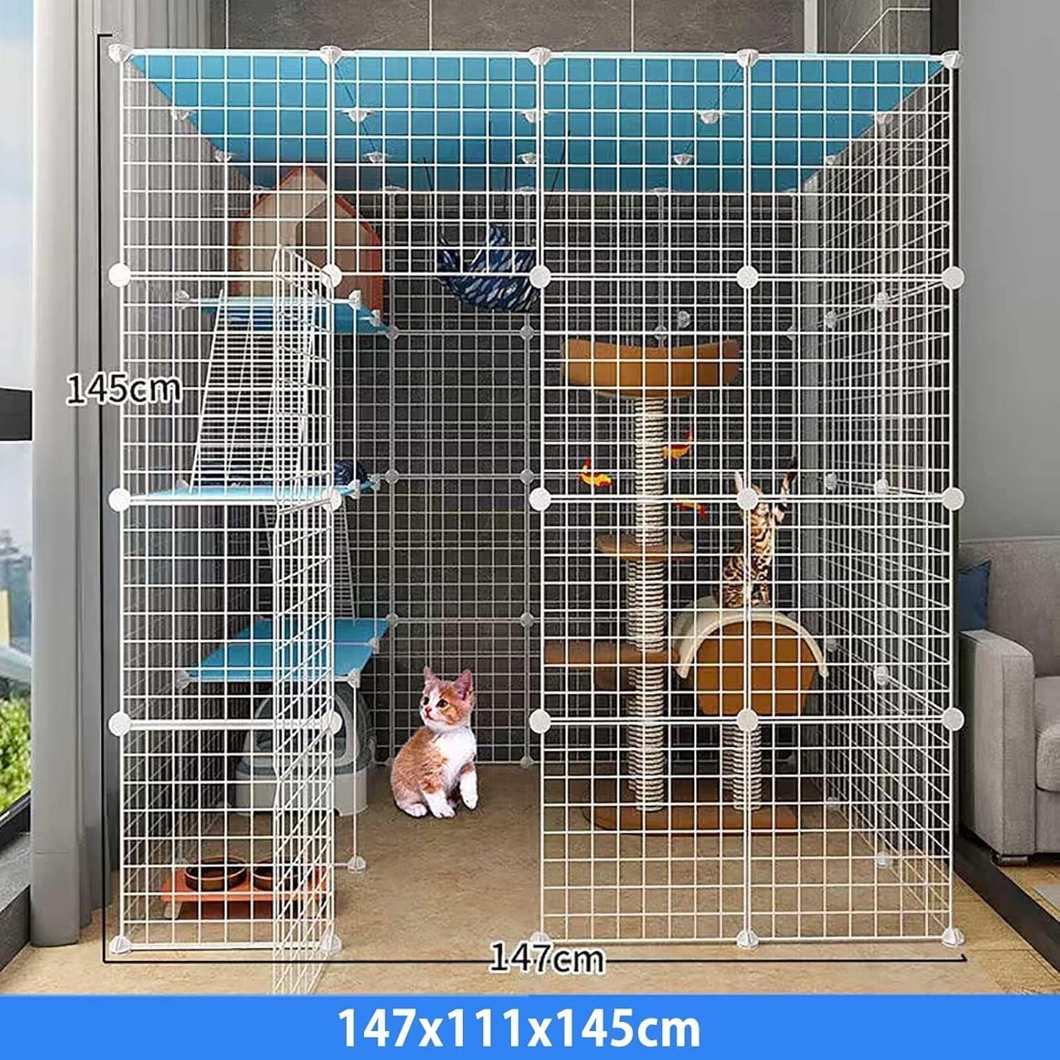 Give your feline friends a playground they deserve with this Large Indoor Cat Cage featuring ramps, ladders, a hammock, and a cozy bed. Designed to accommodate 1 to 4 cats, this spacious cage offers ample room for play, rest, and exploration, making it ideal for energetic cats and small pets like ferrets, guinea pigs, and rabbits. The sturdy metal frame with a rust-resistant coating ensures long-lasting durability and safety, while the thoughtfully spaced wire mesh prevents escape and injury. The oversized doors provide easy access for feeding, cleaning, and bonding with your pets. Thanks to the detachable panels, you can customize the cage’s shape and size to suit your living space perfectly. Assembly is quick and easy, requiring no extra tools, and the cage can be disassembled for convenient transport or storage. Create a fun and secure environment your cats will love — a true amusement park for your little companions.Size: 75x75x109cm , 75x75x145cm , 110x75x109cm , 110x75x145cm , 111x111x145cm , 147x109x145cm , 147x111x145cm , 147x147x145cm(1) , 147x147x145cm(2)Material: pp resinSuitable: cats, guinea pigs and ferrets , Rabbits and other small petsPACKAGE INCLUDED: 1x Cat cage1x Installation toolDoes not include (cat hammock, cat litter box, cat litter, etc.) other accessories