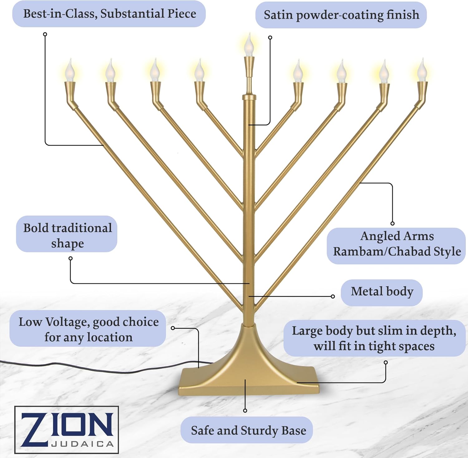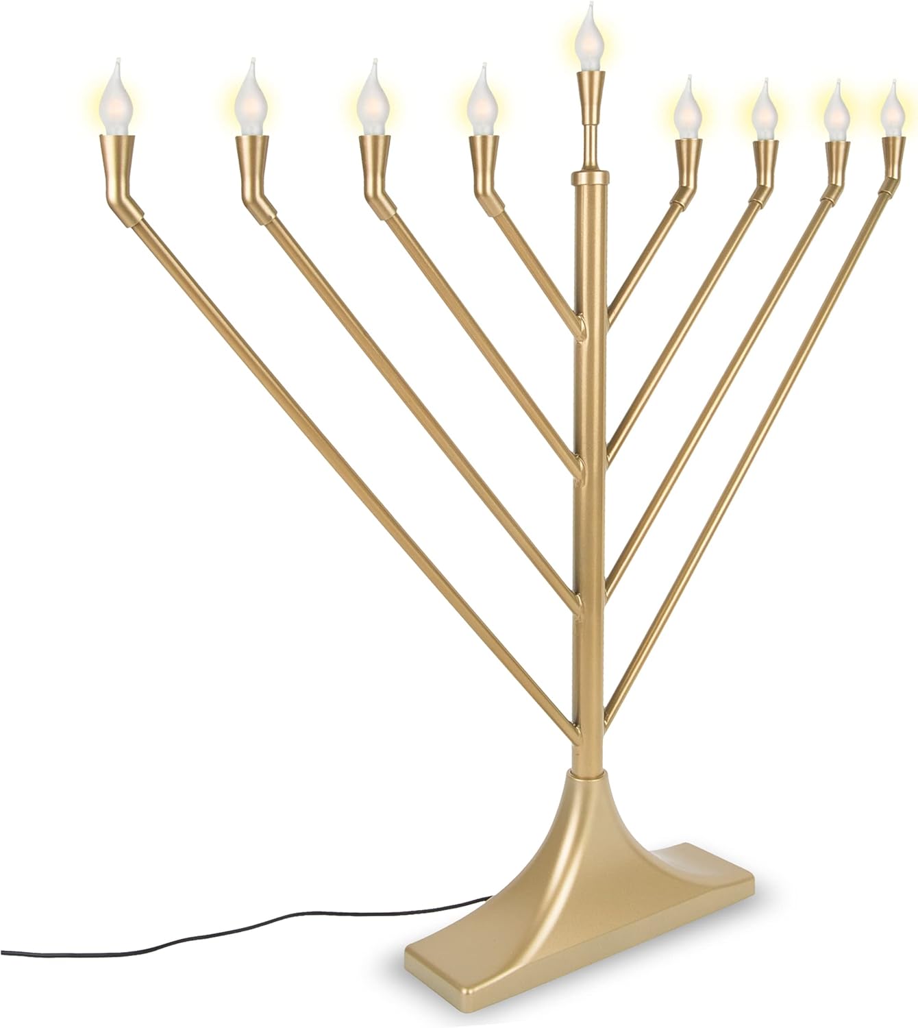 | Included Components | Large Angled Rambam Electric Menorah for Chanukah corded with a USB cable, AC Wall Adaptor, 10 Frosted LED Bulbs E10 |