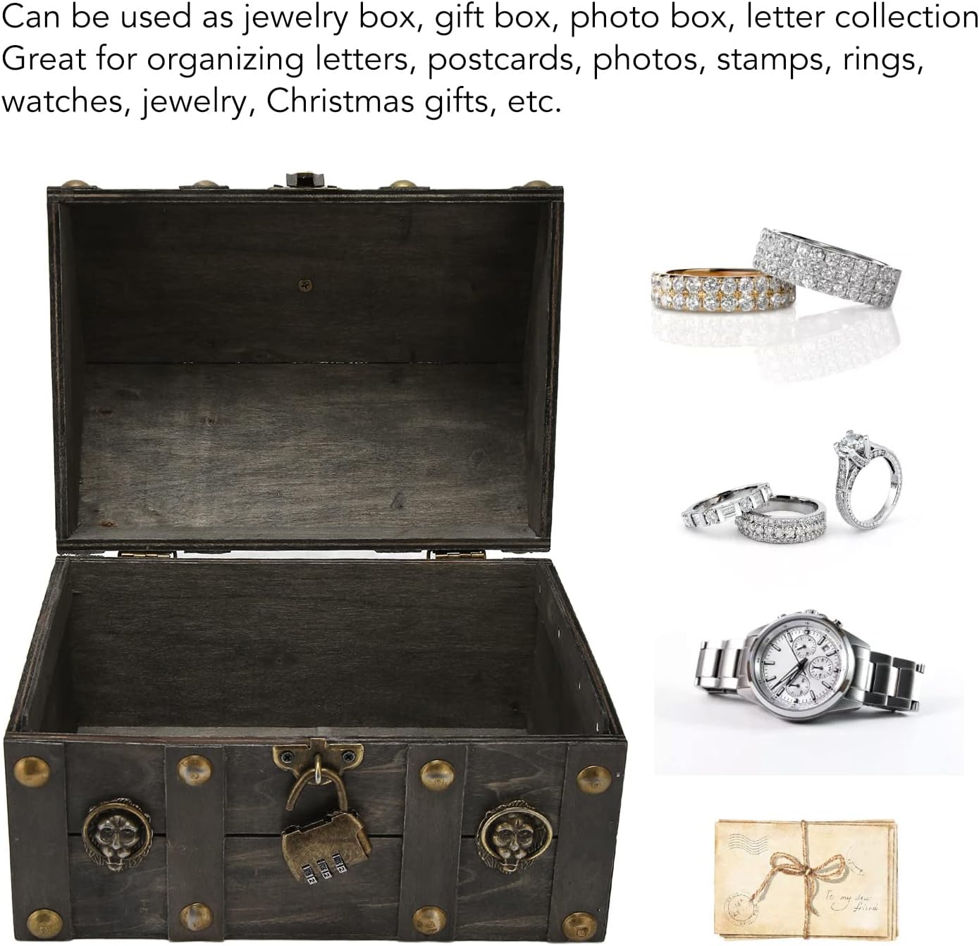Feature:1. Vintage Look: Wooden storage box, distressed gray with a strong sense of time, weathered wood finish, antique style locks. vintage style box to decorate a room.2. Easy to Use: Vintage wooden box's key lock and combination lock are optional, better guard items, easy to use. You can also leave it without a lock and put some small sundries to make the desktop more clean and tidy.3. Widely Used: Wooden treasure chest boxes can be used as jewelry boxes, gift boxes, photo boxes, letter collections. It's also great for organizing letters, postcards, photos, stamps, rings, watches, jewelry, Christmas gifts, and more.4. Initial Password: The initial password of the retro treasure chest storage box is 0, 0, 0, and the three numbers can be pressed to open by tapping into a column on the straight line pointed by the arrowhead at the bottom.5. Reset Password: Small wooden treasure chest boxes can reset the password, you can press the black dot with a needle in the open state, and then rotate to select a new three digit number.Specification:Item Type: Wooden Treasure Chest BoxesMaterial: Composite Wood, AlloySize: Approx. 24x18x17cm / 9.4x7.1x6.7inPackage List:1 x Wooden Treasure Chest Boxes 1 x Combination LockNote:Please allow some error in manual measurement.