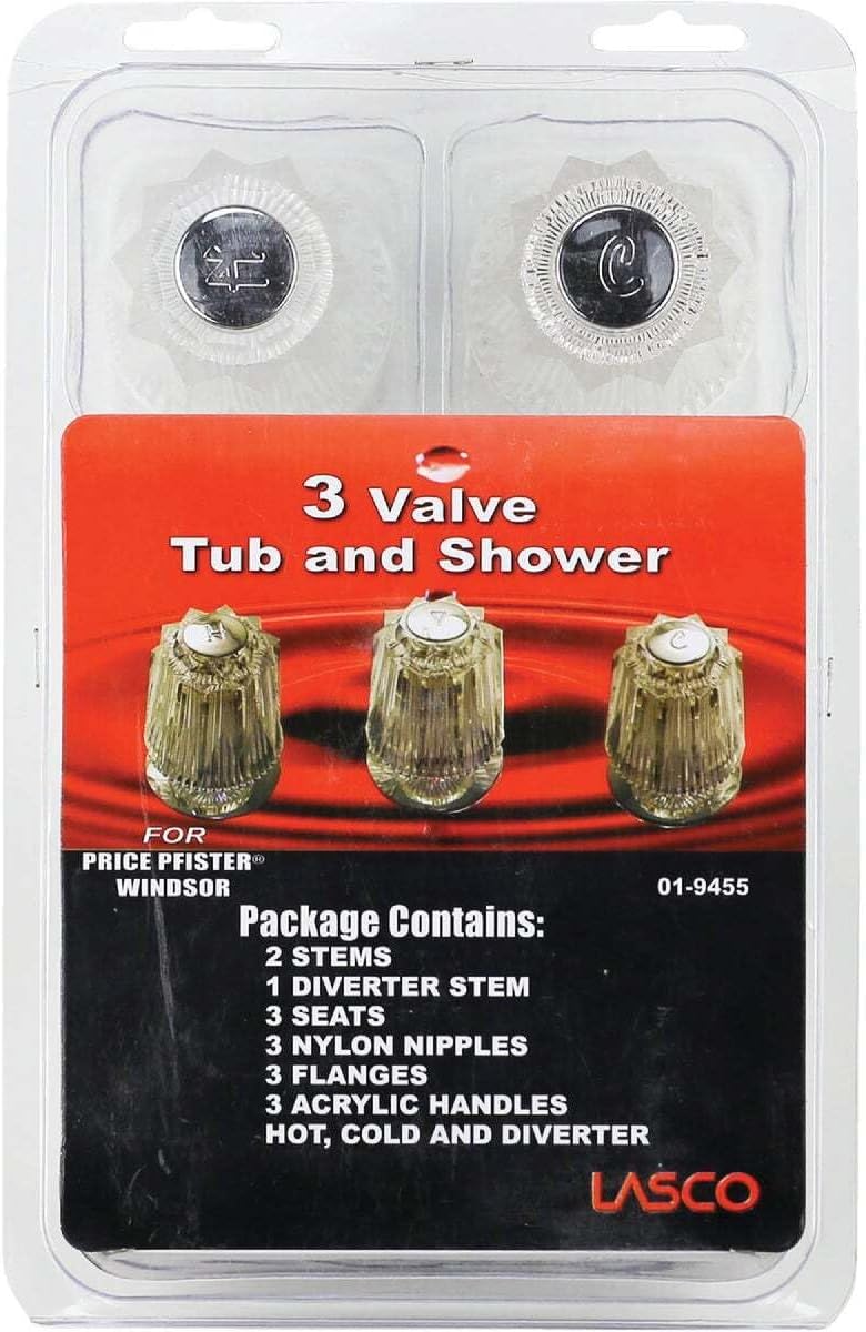 Product Description LASCO 01-9455 Price Pfister, Three Valve Windsor Trim Set With Stems. 3 Valve, Large Windsor[plastic handle]. Trim for chrome tub / shower valve. Includes: [3] stems, handles, flanges and nipples. Replacement trim set. Price-Pfister. Price Pfister, Three Valve, Windsor, Tub and Shower, Trim Set, Includes Hot and Cold and Diverter Handles With Buttons and Screws, Chrome Flanges, Plastic Nipples, Hot, Cold, and Diverter Stems, Seats, Carded From the Manufacturer LASCO 01-9455 Price Pfister, Three Valve Windsor Trim Set With Stems. 3 Valve, Large Windsor[plastic handle]. Trim for chrome tub / shower valve. Includes: [3] stems, handles, flanges and nipples. Replacement trim set. Price-Pfister. Price Pfister, Three Valve, Windsor, Tub and Shower, Trim Set, Includes Hot and Cold and Diverter Handles With Buttons and Screws, Chrome Flanges, Plastic Nipples, Hot, Cold, and Diverter Stems, Seats, Carded