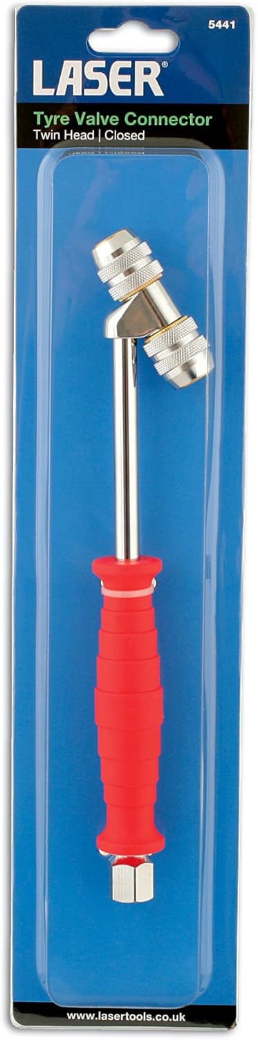 Tyre valve connector with twin head, clip on application and closed end. A British tool company based in Warwickshire, United Kingdom. Laser Tools draws on years of experience to introduce quality products which offer real value for money. All our products are responsibly sourced both from trusted ethical partners across the world PLUS (uniquely as an automotive tool brand) our own manufacturing base in the UK. Combining our British manufacturing, our years of experience and vast expertise in the automotive sector helps us achieve our aim of bringing high quality tool solutions first to market and being No.1 choice for many professional mechanics.