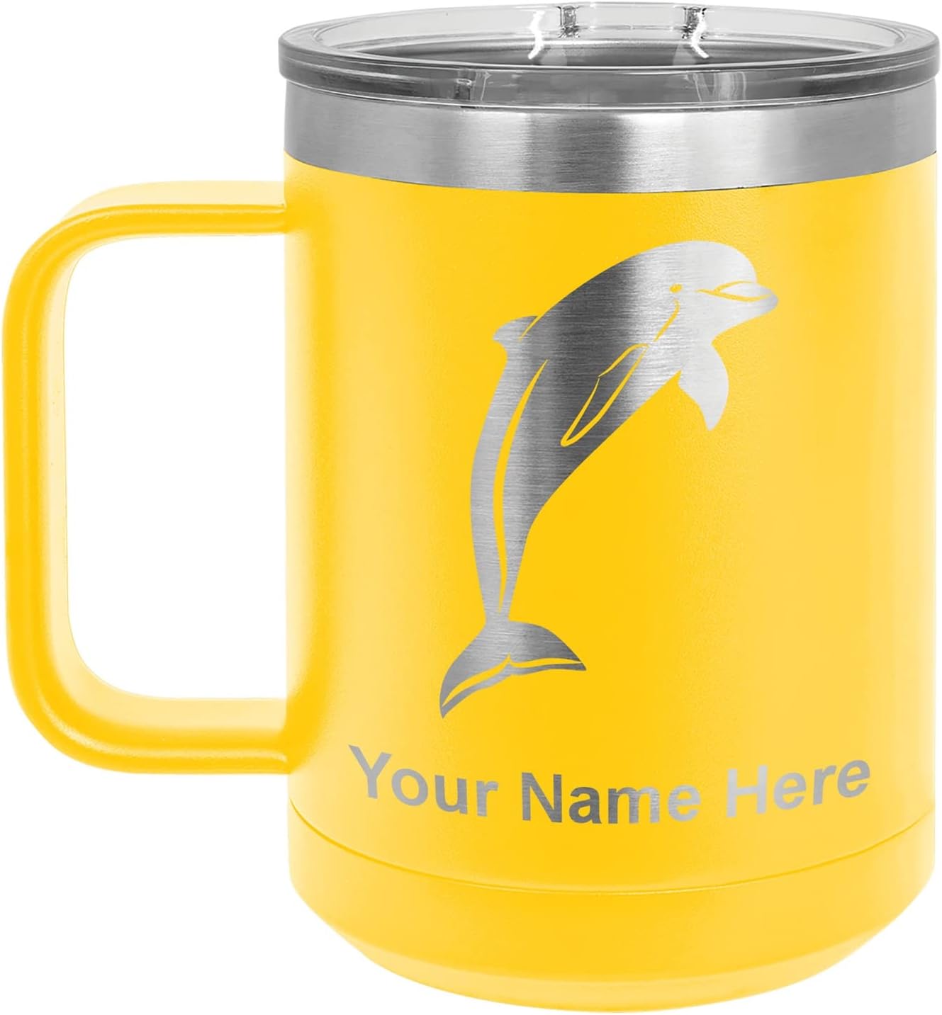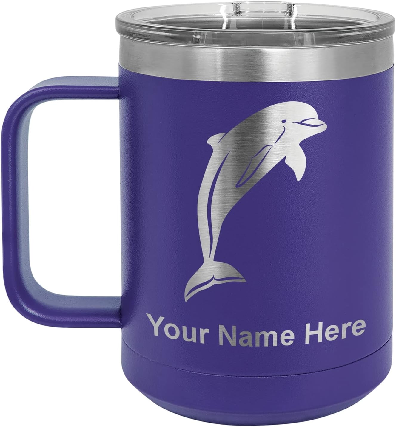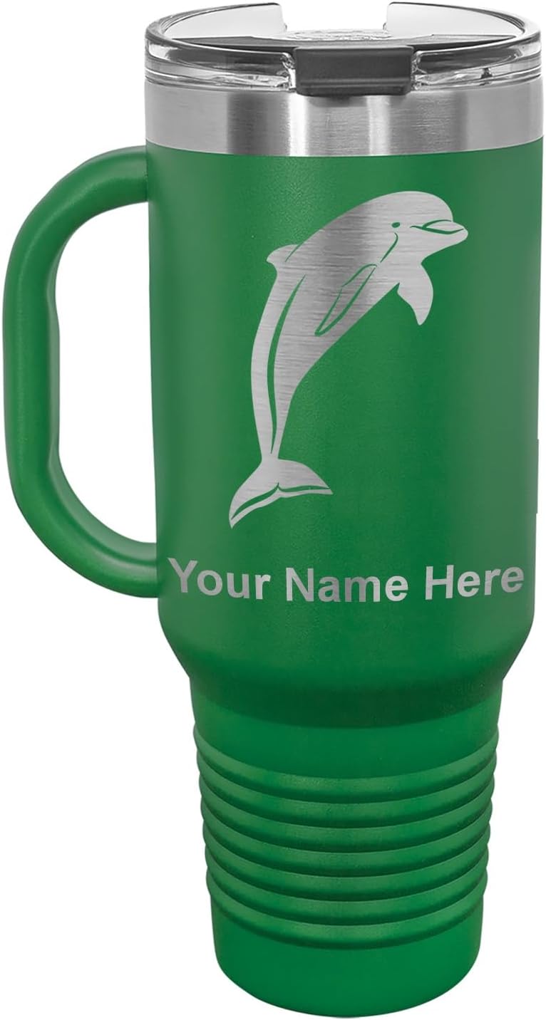 LaserGram 40 ounce Travel Mug with Handle that is laser engraved with the image that you see in the photo. Your own personalized text will be laser engraved below the image. Features double-walled stainless steel vacuum insulation with a clear lid. Click the "Customize Now" button to begin customizing your mug.