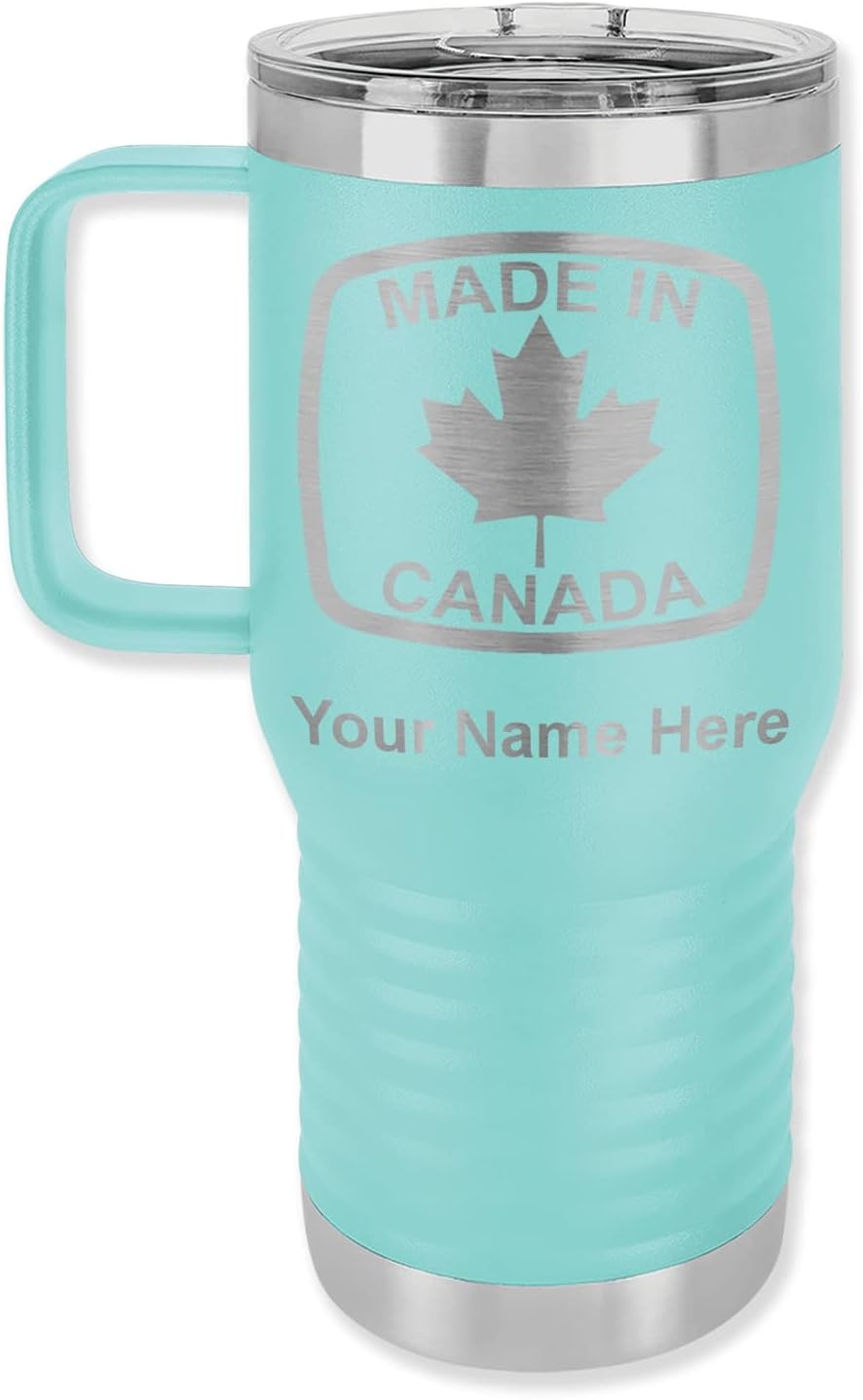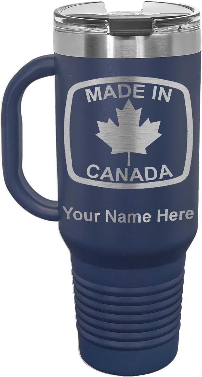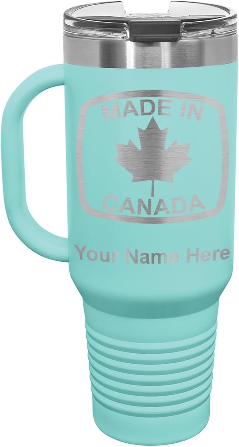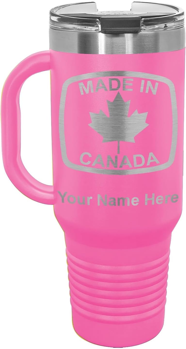 LaserGram 40 ounce Travel Mug with Handle that is laser engraved with the image that you see in the photo. Your own personalized text will be laser engraved below the image. Features double-walled stainless steel vacuum insulation with a clear lid. Click the "Customize Now" button to begin customizing your mug.