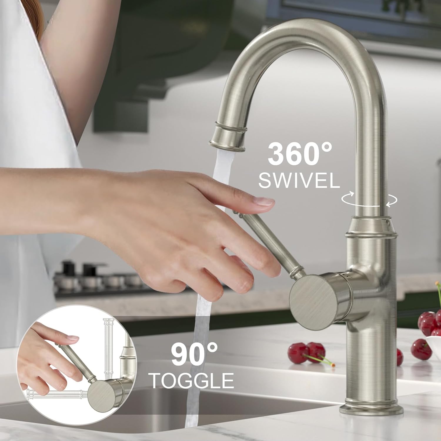 • Elegant Finish - The brushed nickel kitchen sink and bar sink faucet is brushed finish plated with multiple layers to resists water spots and fingerprint, requiring less cleaning. An elegant matte gray with visible brush lines, this finish eliminates reflection, creating a tonal experience that works in classic to modern environments. Match various decoration styles, whether it is modern, vintage or farmhouse style kitchen
