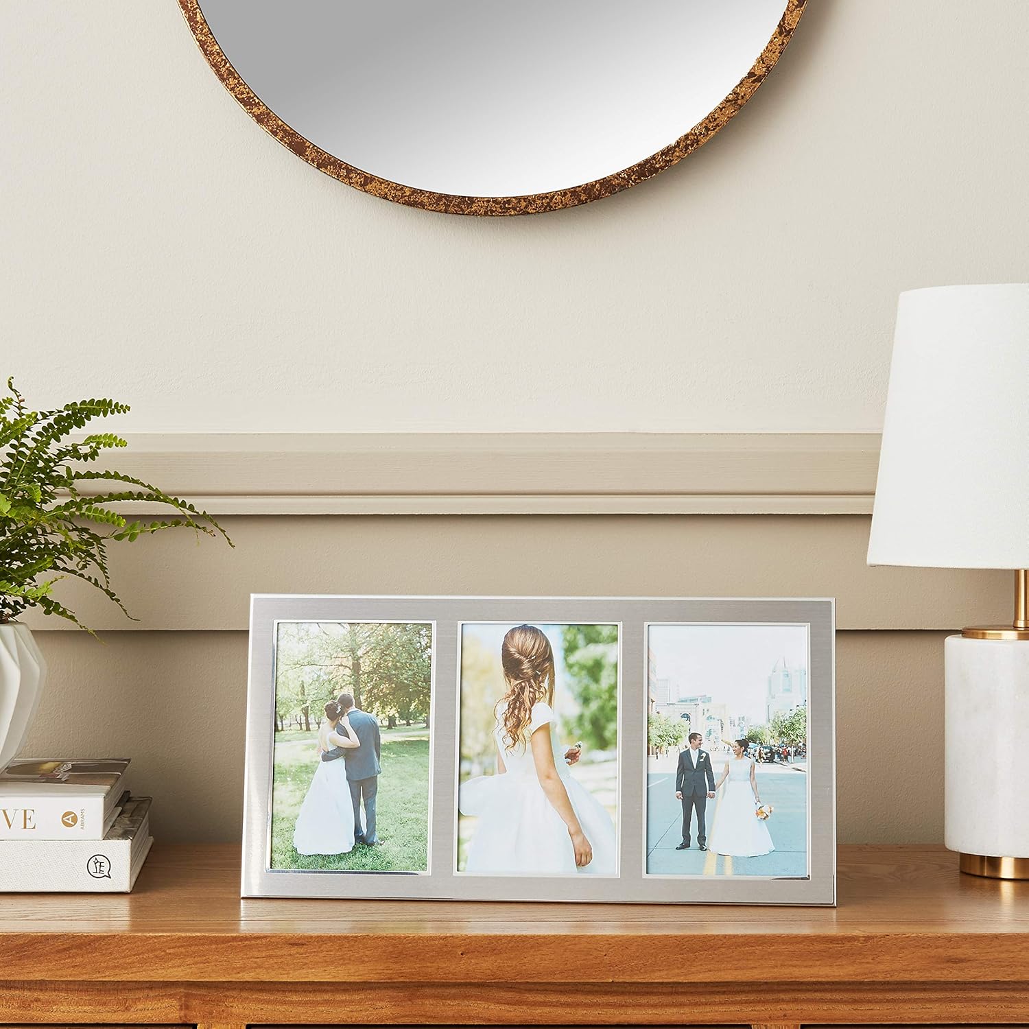 Contemporary silver metal panel picture frame with brushed satin silver metal front. Holds three vertical or horizontal 4x6 photos. Beautiful black velvet backing comes with an easel for vertical or horizontal table top display & hangers for vertical or horizontal wall mounting. High quality metal picture frame is made with exceptional workmanship and comes individually boxed.