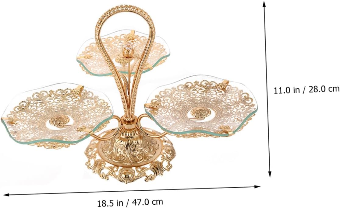 Package List 1 x Fruit Plate Characteristics -Color: Golden -Product Info:Multi-layer fruit tray -Material: Iron & Glass -Size: Approx. 47.00X41.00X28.00cm / 18.47X16.11X11.00in - 3 plates design, enough space for storage, suitable for most occasions and events Home Serving Tray. - The reasonable size, without taking up too much space when putting on the desk. - This dessert stand with fine workmanship, not easy to wear and tear, very practical in performance cupcake fruits holder. - Simple but decorative, it shows your personality and taste Tea Table Fruit Plates. - You can easily buy this practical and decorative dessert stand at an snacks fruit plate.Goods InformationMulti-layer Food Plate Simple but generous, it can store your food and other items, but also can decorate your home.Party Afternoon Tea Tray You can also share it with your family and friends.snack fruit plate If you are looking for a dessert stand, then you miss our dessert stand