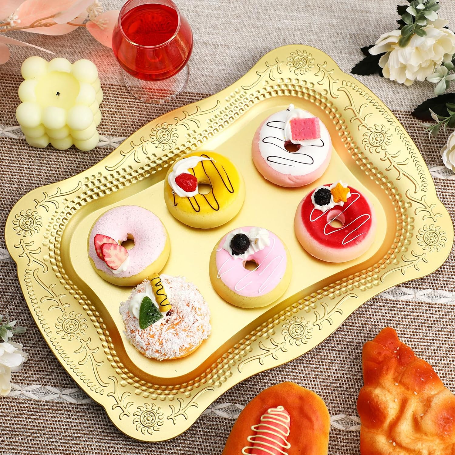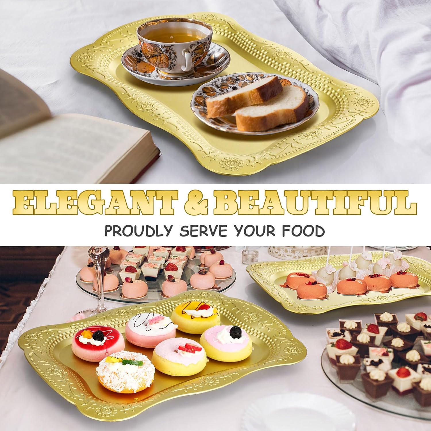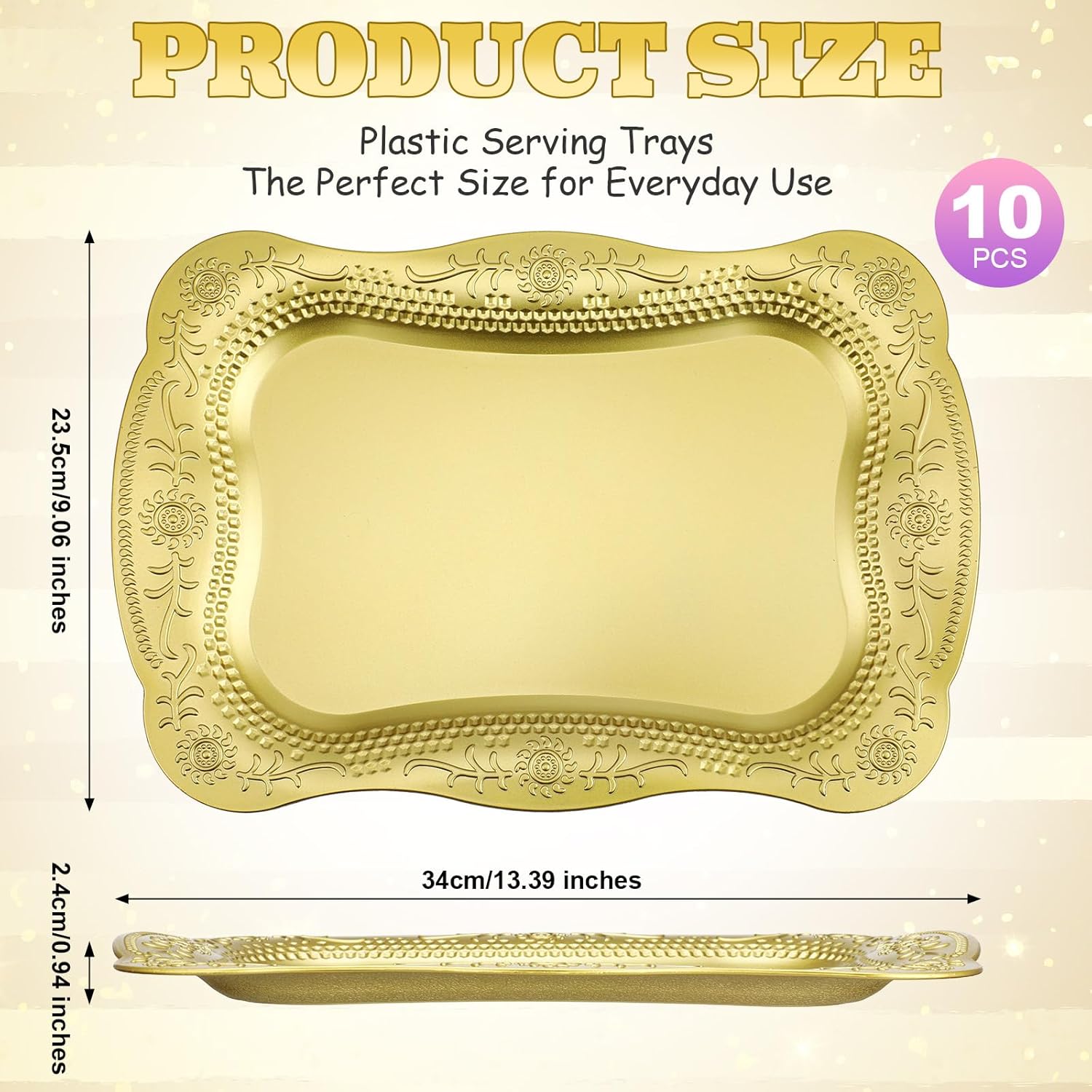Features: Elegant gold color: Radiate elegance with our bright gold colored serving platter, setting your events apart. The vibrant color brings sophistication to your table, enhancing your dining experience. Whether applied for special occasions or regular meals, our gold serving trays make every serving moment memorable. Ideal gift: Our gold serving dishes make for an ideal gift due to their universal utility and striking aesthetics. Given their ample quantity and the beauty they bring to any dining setting, these trays are a choice for housewarming, wedding, or bridal shower gifts. Specifications: Material: polystyrene plasticColor: gold Size: about 13 x 9 x 0.8 inches/ 34 x 23.5 x 2 cmPackage includes: 10 x Gold serving tray Notes: Manual measurement, please allow slight errors on size. The color may exist a slight difference due to different screen displays. Not microwaveable, proper for serving cold, room temperature or slightly warm foods, hot food not allowed.