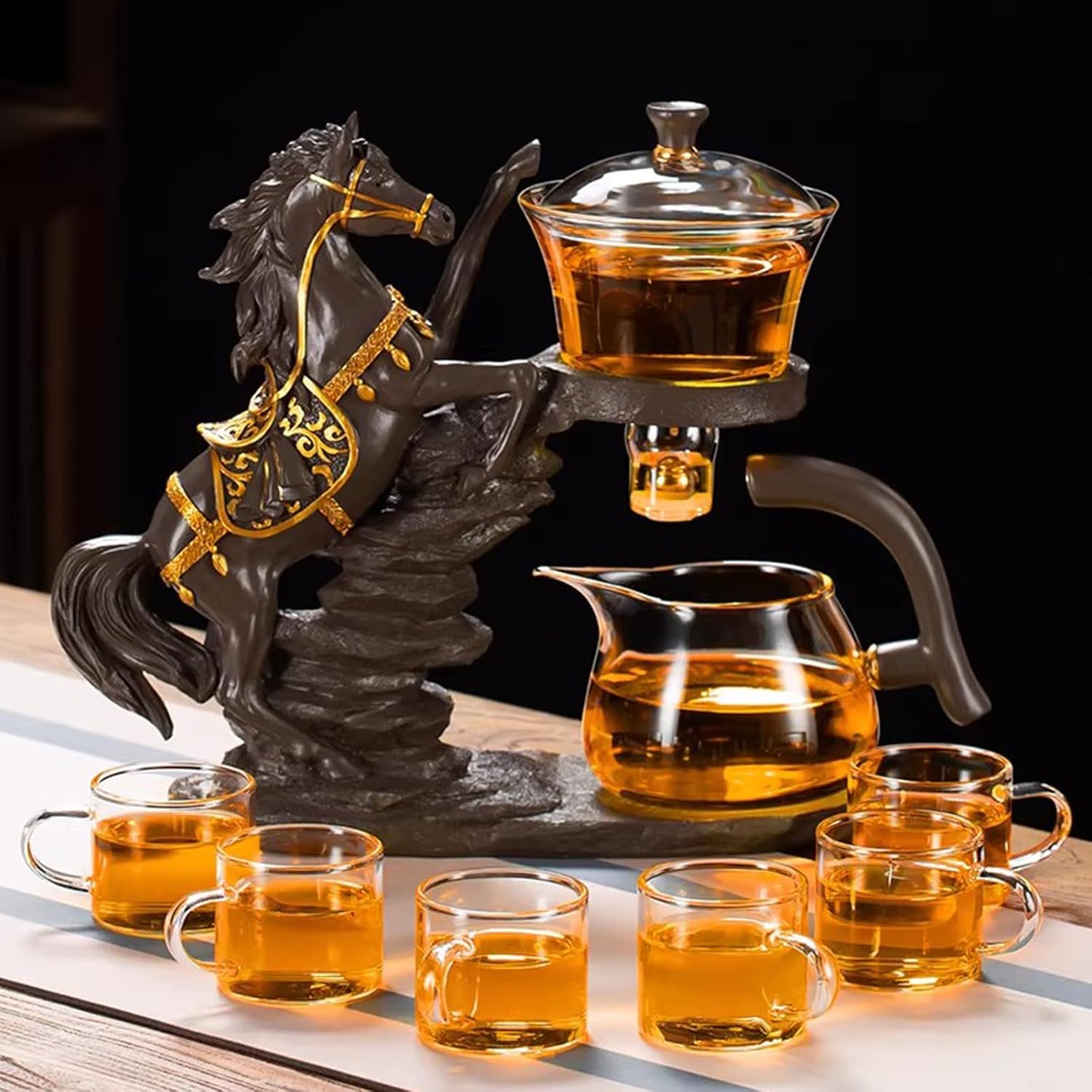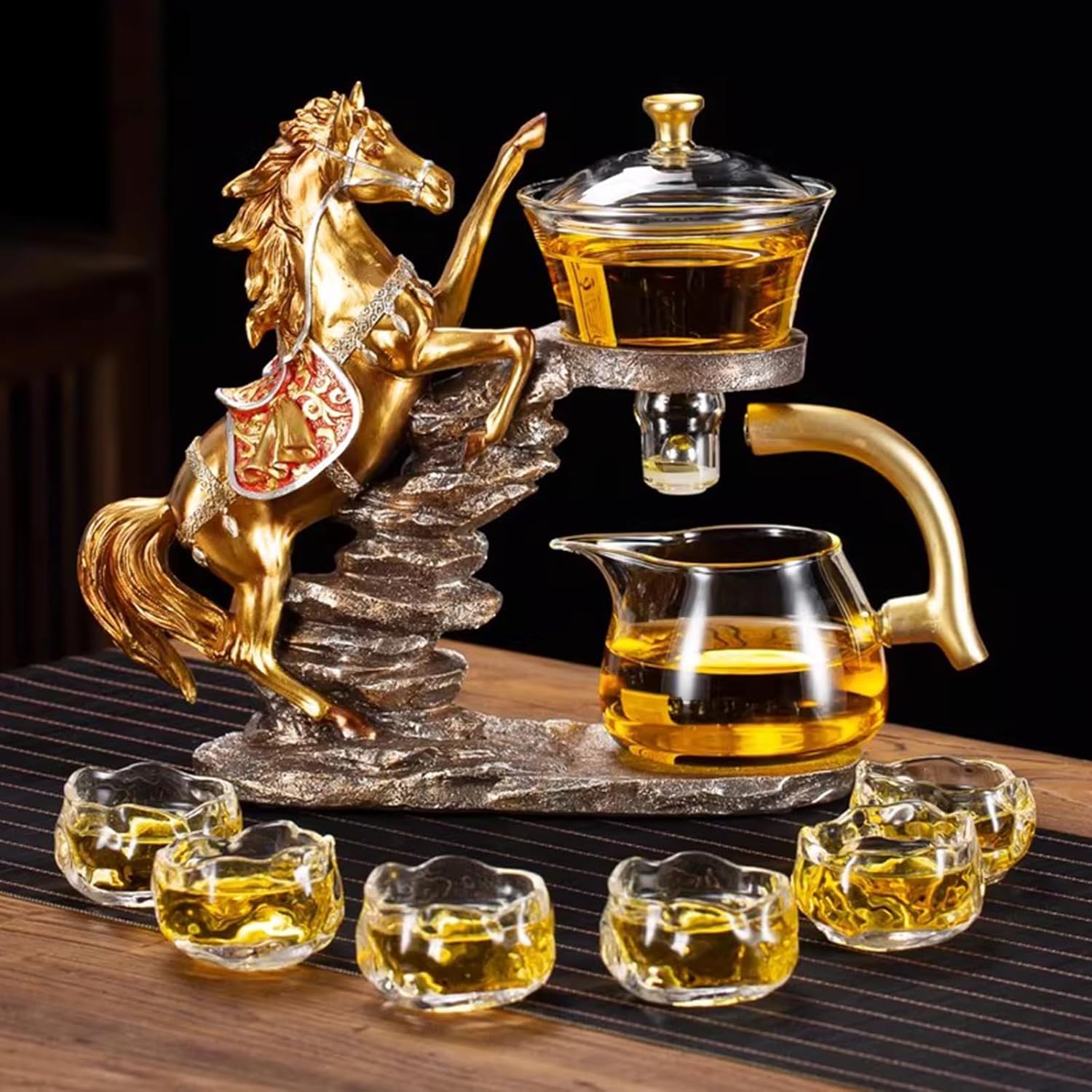 Elevate your tea ritual with the Horse-Themed Magnetic Automatic Tea Set – where traditional Kung Fu tea culture meets modern convenience. This all-in-one set is designed to make every tea moment effortless, elegant, and memorable. Whether you’re a tea enthusiast or a decor lover, this set brings a touch of luxury to your daily life.3 Key Features: - Simply move the handle to start/stop, eliminating messy spills and making tea time stress-free.- Handcrafted resin horse base with intricate carving and golden finish, symbolizing "success and prosperity". - It doubles as a decorative piece for your home, office, or tea room.SPECIFICATIONS:Name: Horse-Themed Magnetic Automatic Tea SetMa: Resin+GlassApplicable: Home, Office, Tea Room, Perfect for Housewarming, Birthday, and Holiday GiftsPackage Includes: 1 Magnetic Teapot with Lid, 1 Glass Pitcher, 1 Stainless Steel Infuser, 6 Cups, 1 Resin Horse Base