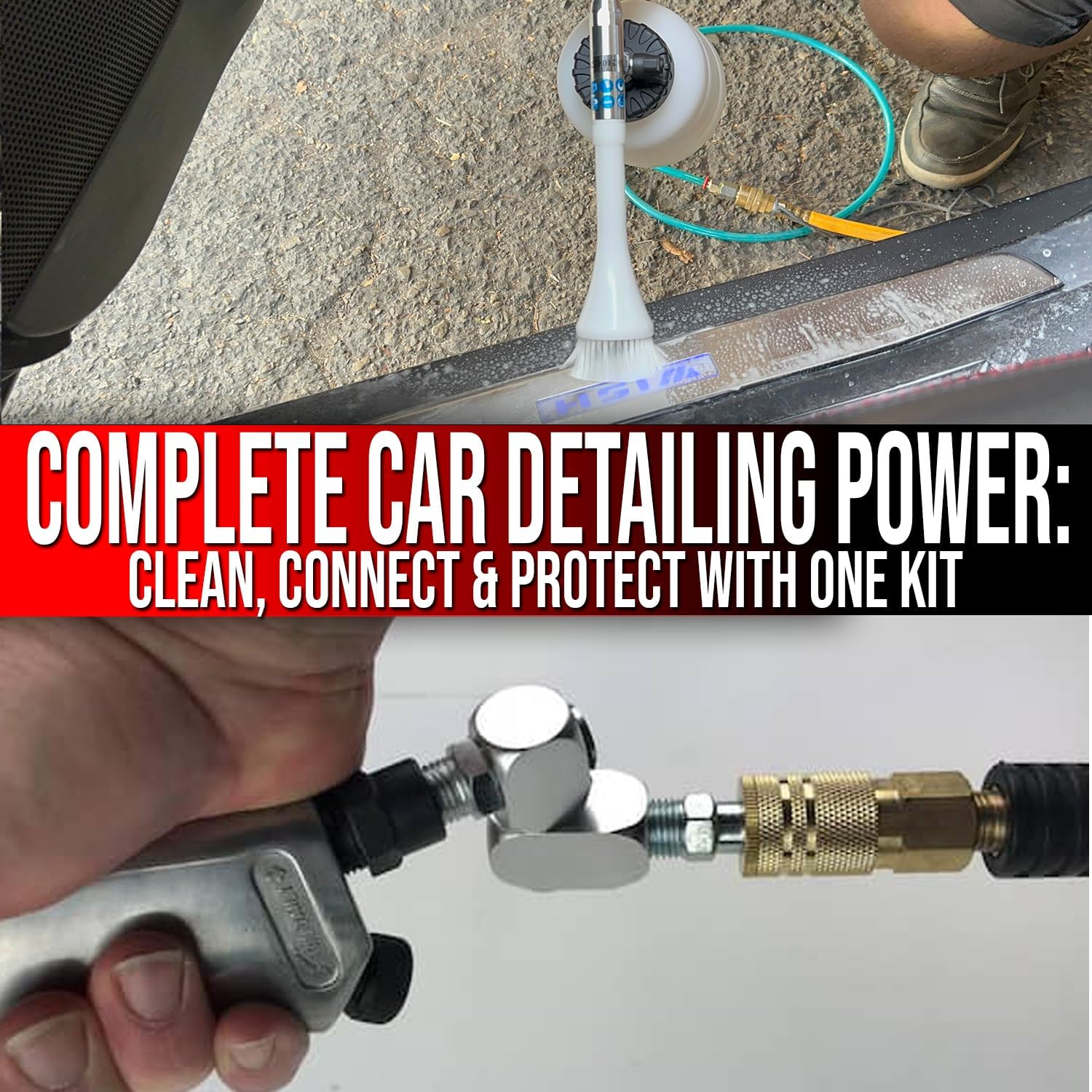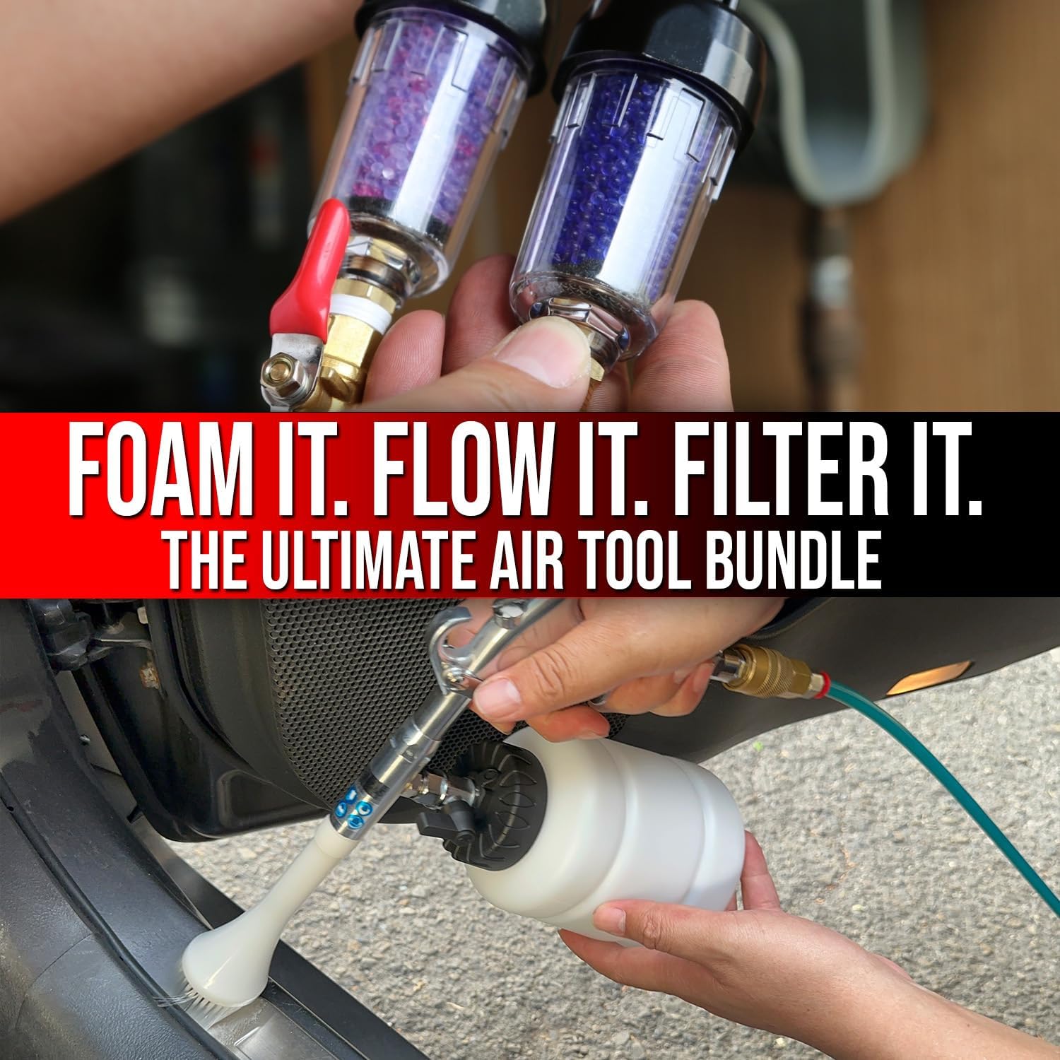 Powerful car detailing kit with foam gun, swivel air fitting & desiccant dryer for spotless cleaning and smooth tool performance.