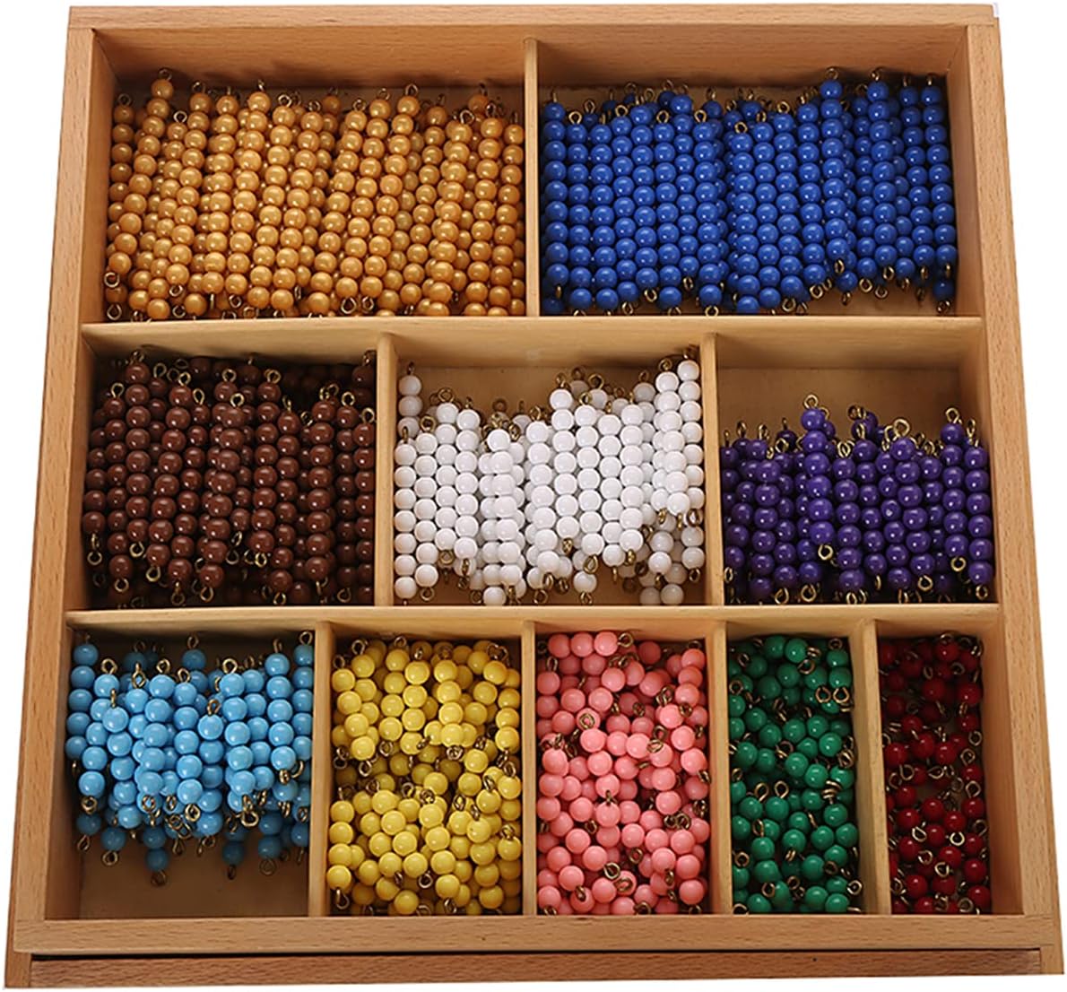 A wooden compartment box contains 55 sets of the colored bead bars 1-10Learning for addition, subtraction, multiplication and division;Eco-friendly wooden and handmade, 100% meet the stardard of the international REPORT EN71-3, ASTMF-971, follow the AMS & AMI standard;The product could use at montessori kindergarten or homeuse for early learning development, or occupational therapy;Nothing goes into the mind that does not first go through the hands