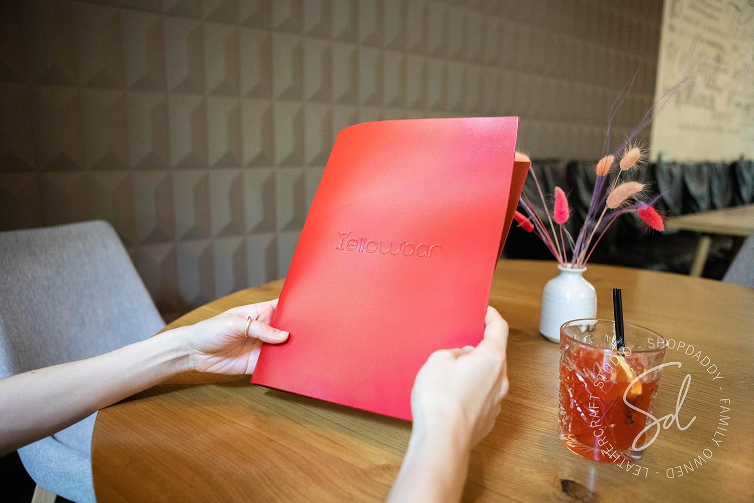 This leather binder-view menu cover combines refined aesthetics with everyday functionality, making it a perfect choice for restaurants, cafés, and hotels that value style and durability. Each piece is made from thick full-grain leather — a premium natural material known for its texture, strength, and long-lasting quality. The metal ring mechanism securely holds your printed menu sheets, allowing for easy updates and ensuring your presentation always looks neat and professional. Its minimalist design blends effortlessly into any interior — from rustic bistros to modern fine-dining venues — highlighting the authenticity of natural leather. Every menu cover can be personalized with your logo or custom text, helping reinforce your brand identity and create a cohesive table presentation. Built for intensive use, this binder menu cover retains its elegant appearance even after years of daily service, offering both practicality and sophistication for your establishment.