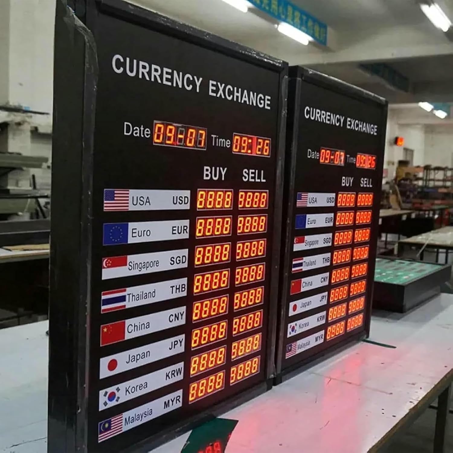 Specifications: Name: LED Electronic Exchange Rate Display Clock Structure: Aluminum alloy frame, acrylic color-printed panel Product dimensions: 700×81×1100×75 mm Digital display size: 25×83.5 mm (1.0 inch) Bar display size: 60×86 mm Power: 120W Display Color: Red (Brightness 300 MCD) Operating Environment: Indoor -15°C to +45°C Control Distance: Within 5 meters Functions: Bank exchange rate updates, automatic date and time display. IR infrared remote control. LED display text, USB drive content transfer Package Contents: LED Electronic Exchange Rate Display Clock Remote Control