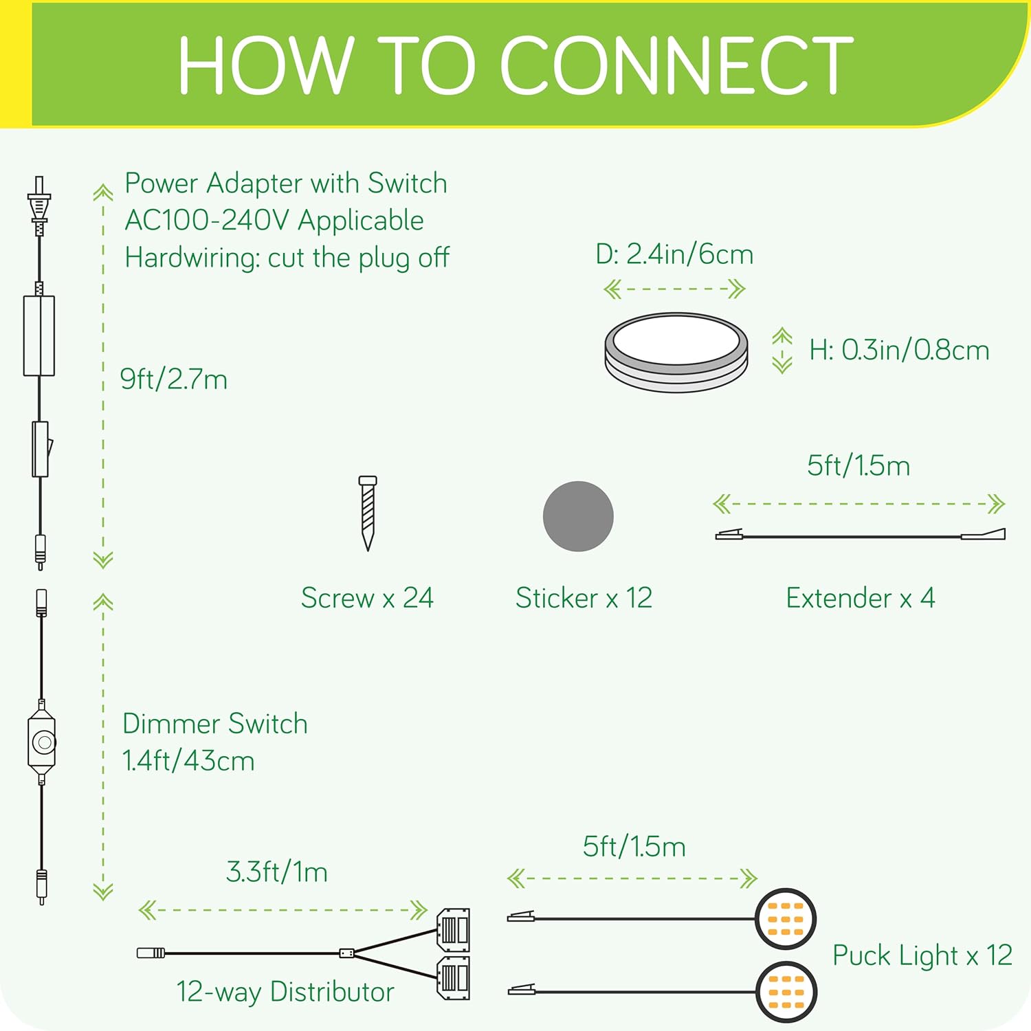 | Included Components | Power adapter, dimmer switch, splitter, puck lights, extension cables, screws, stickers |