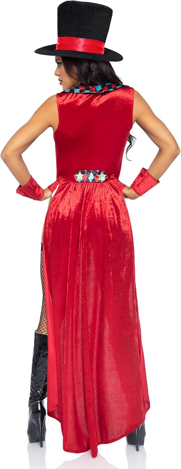 • Steal the show and become the darling of the big top in the Leg Avenue 4 Piece Ring Mistress Costume featuring a halter bodysuit with velvet bodice and bow tie, velvet jacket with long tails, cuffs, and oversized top hat